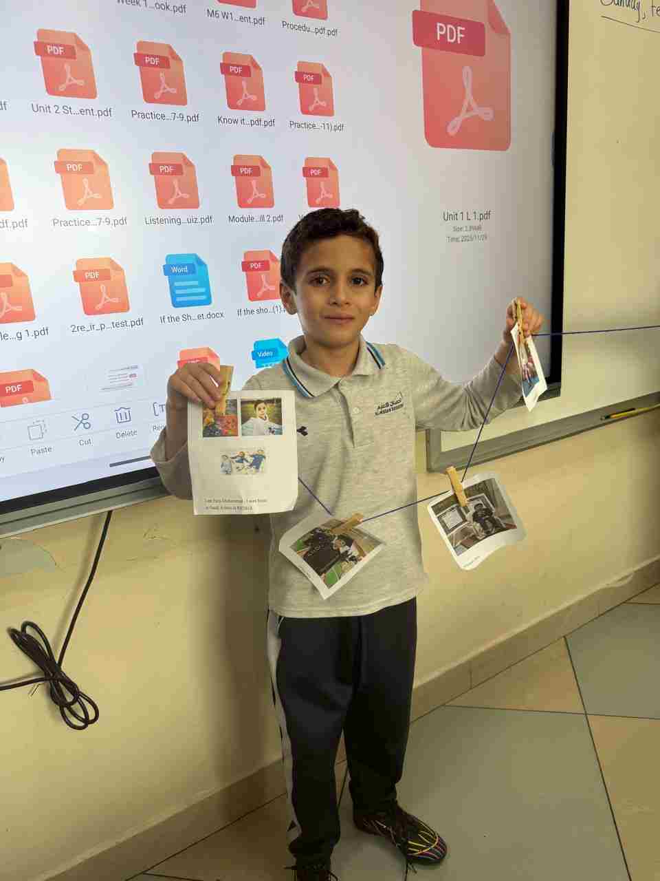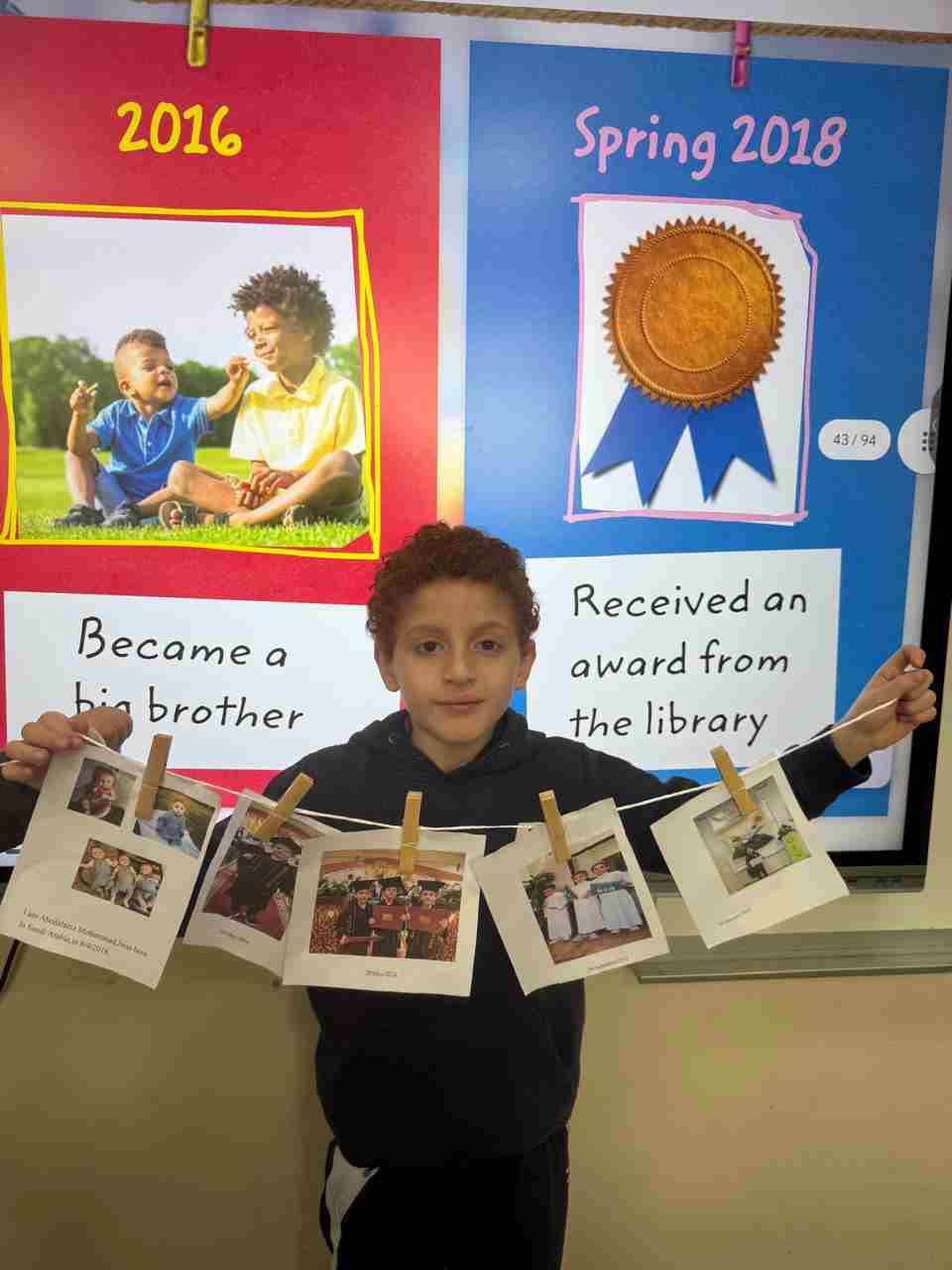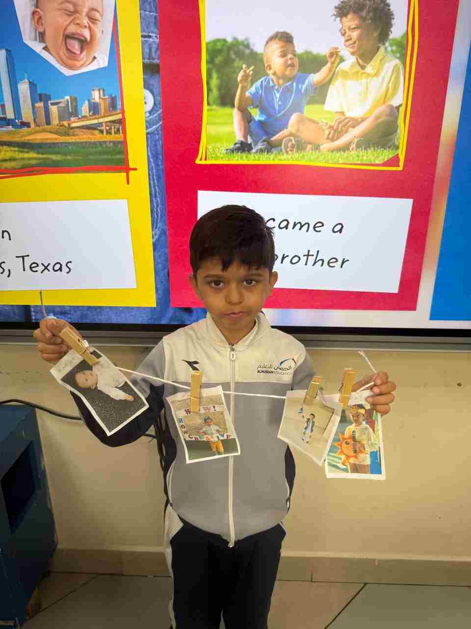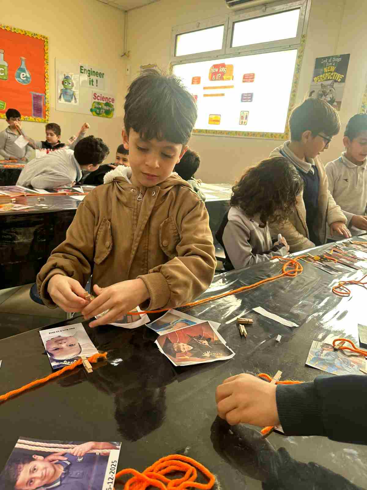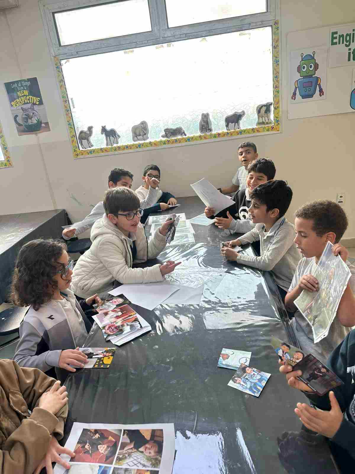 Students in Grade 2, enjoy the English timeline activity at the playground. They talk about events from their life, starting when they were a baby and growing into a child.