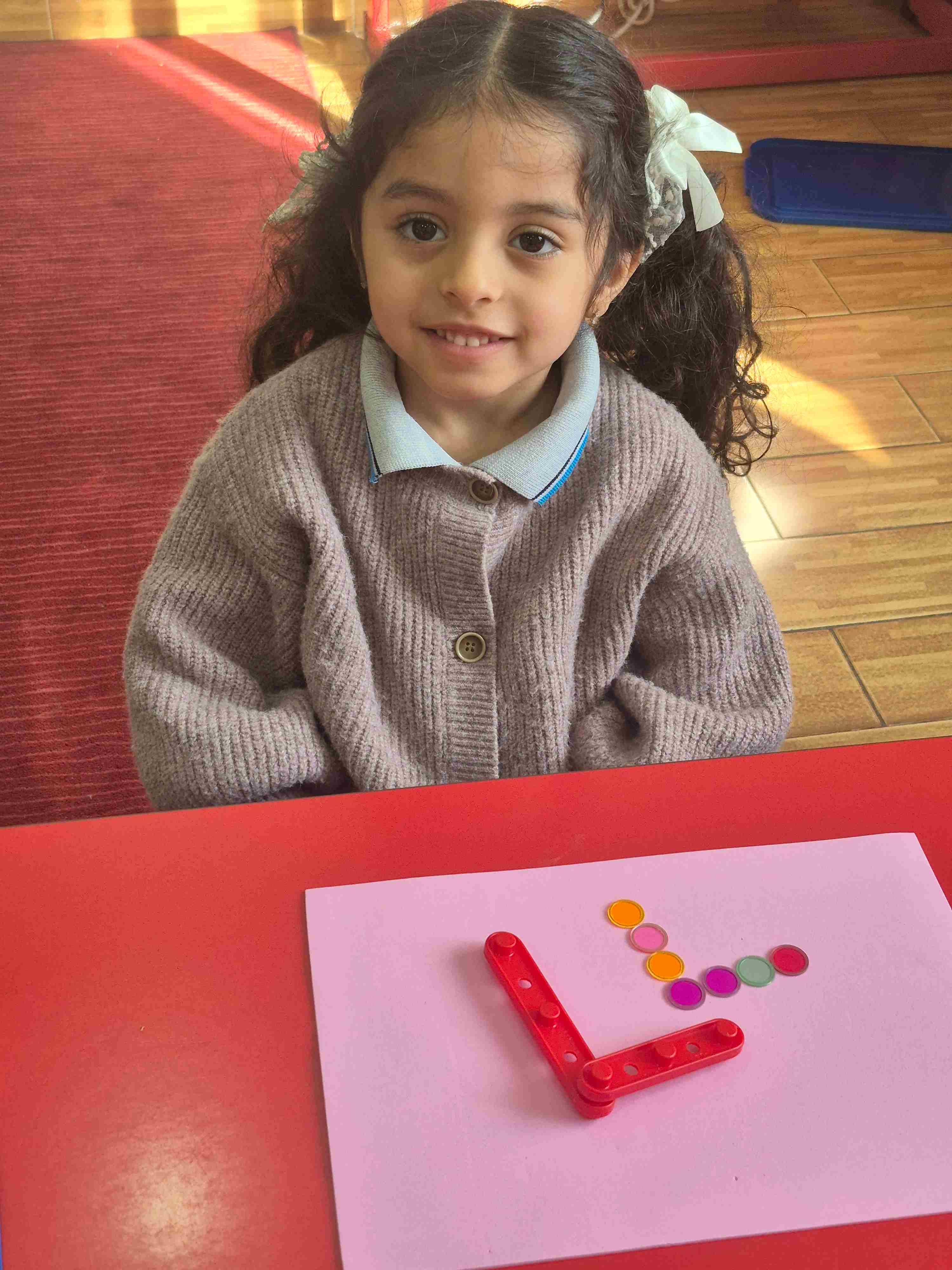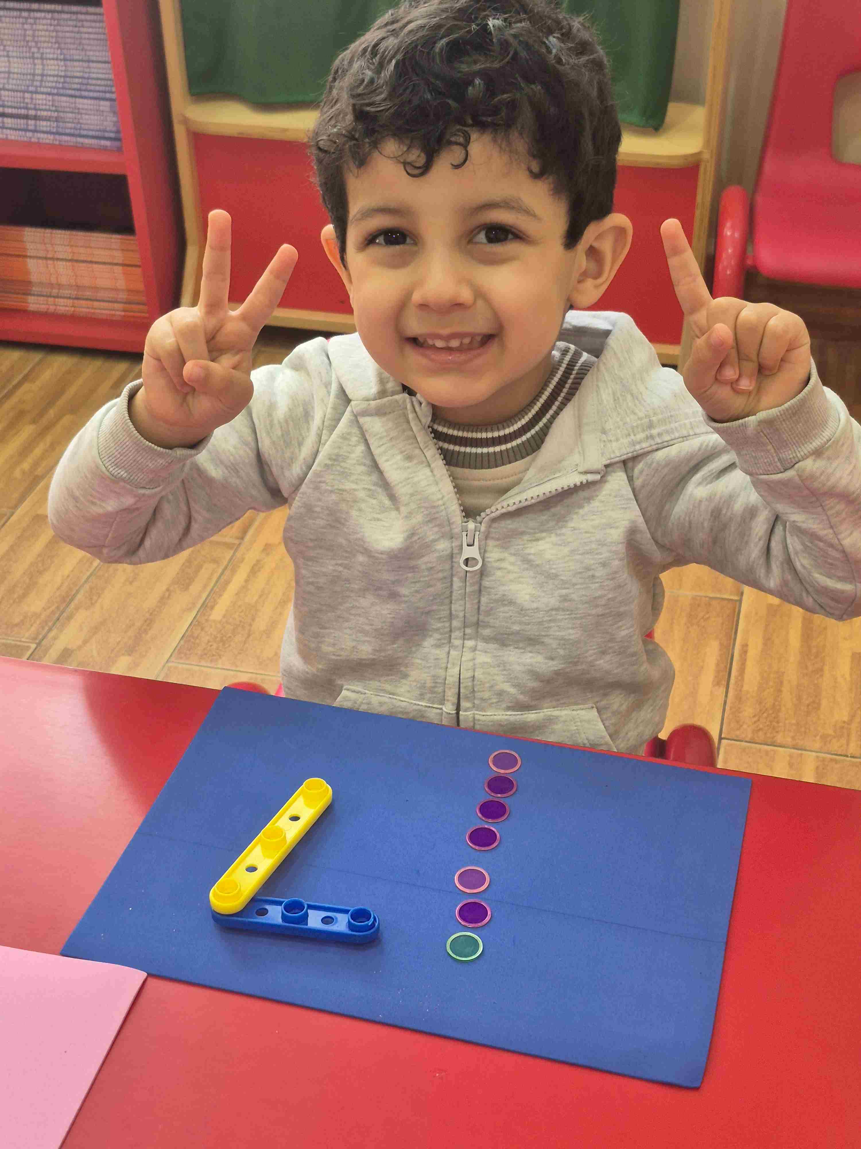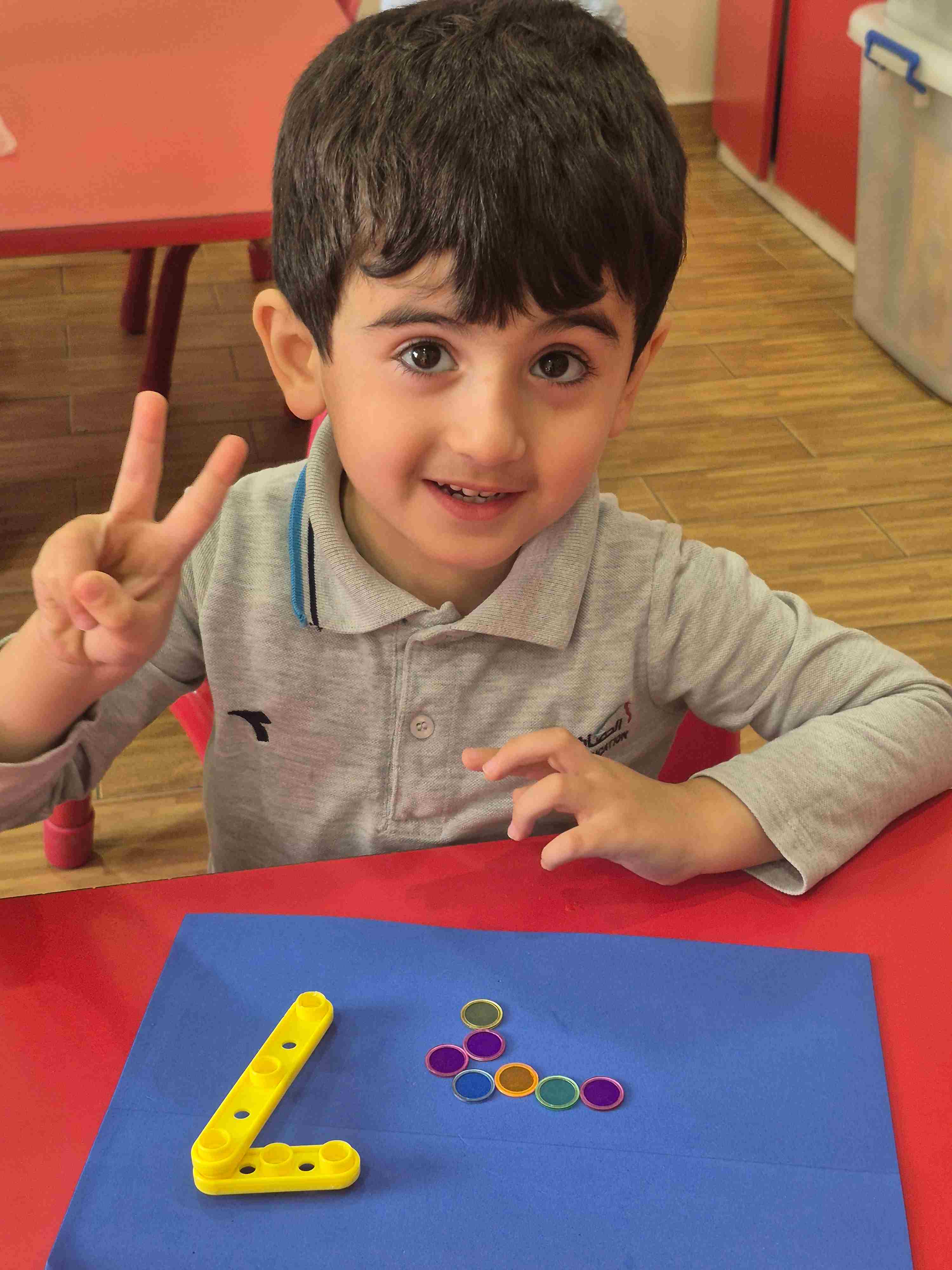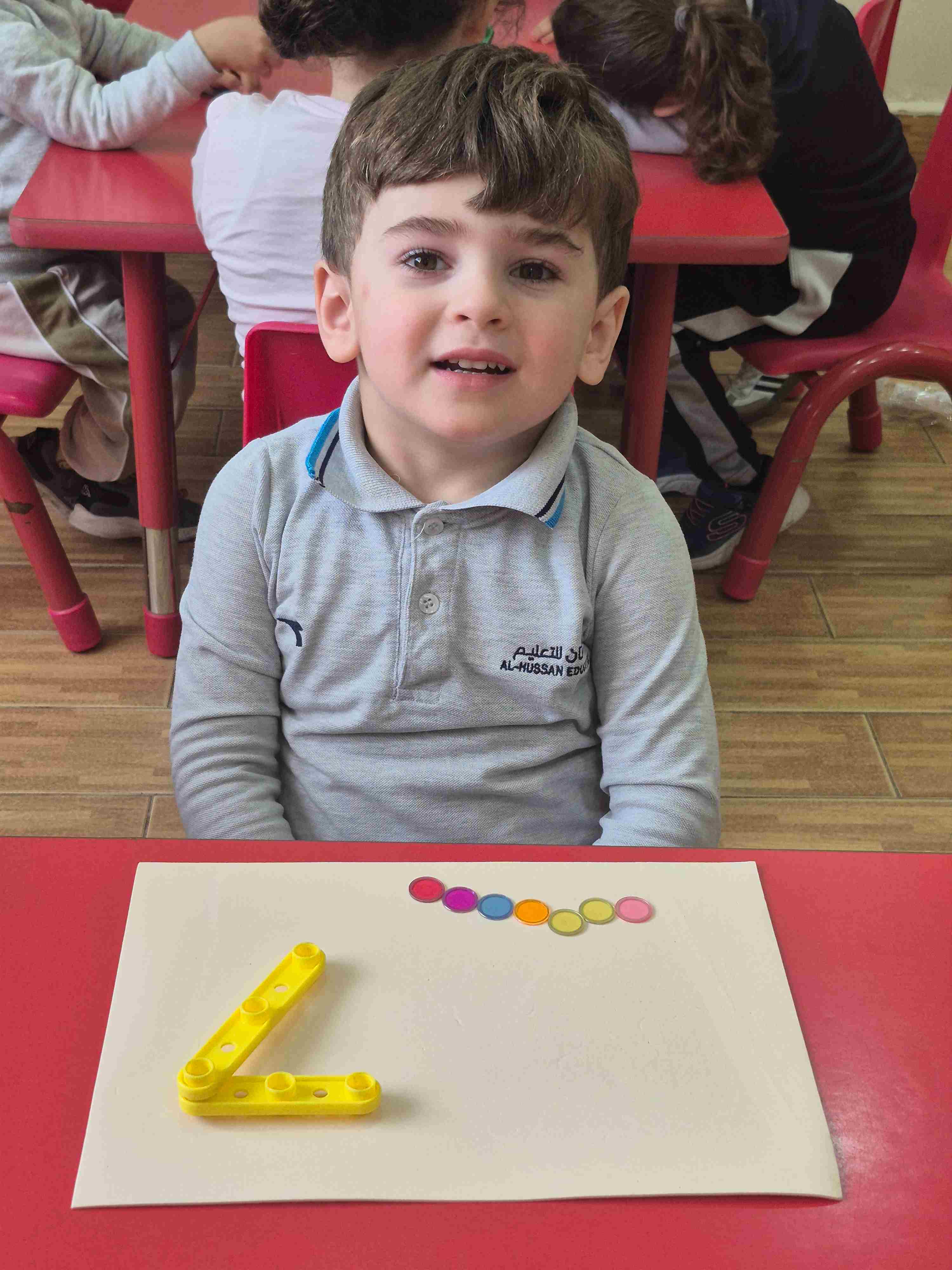 Our KG1 students enjoyed a hands-on math activity focused on number 7. Using sticks, students created the shape of number 7, strengthening number recognition and fine motor skills. After forming the number, students practiced counting aloud from 1 to 7 and placed seven plastic chips, matching one chip to each count.