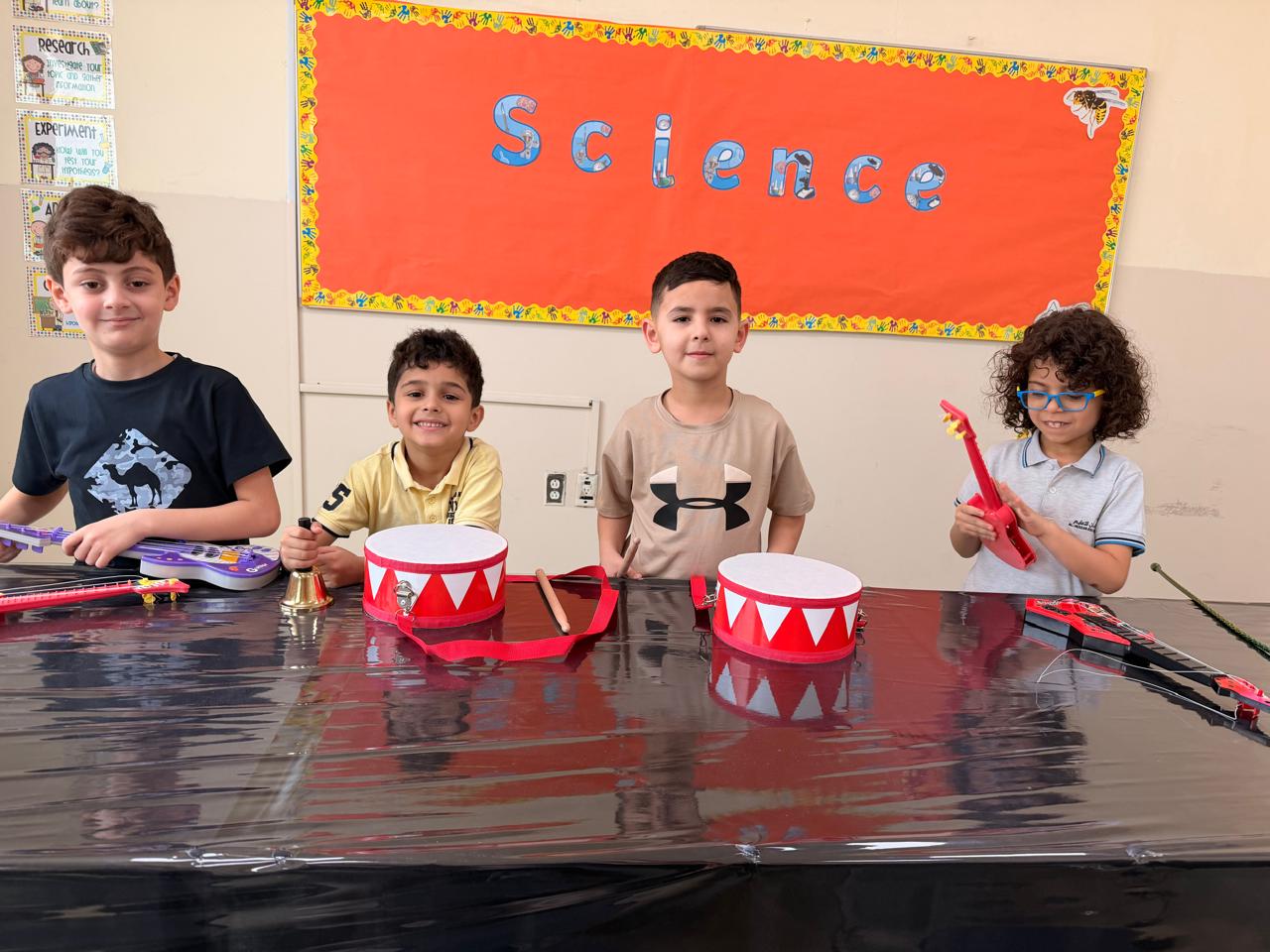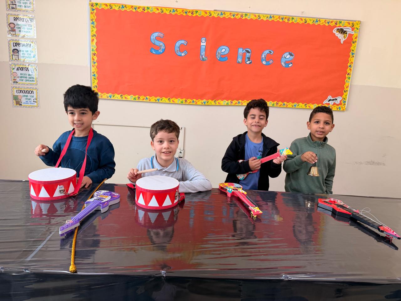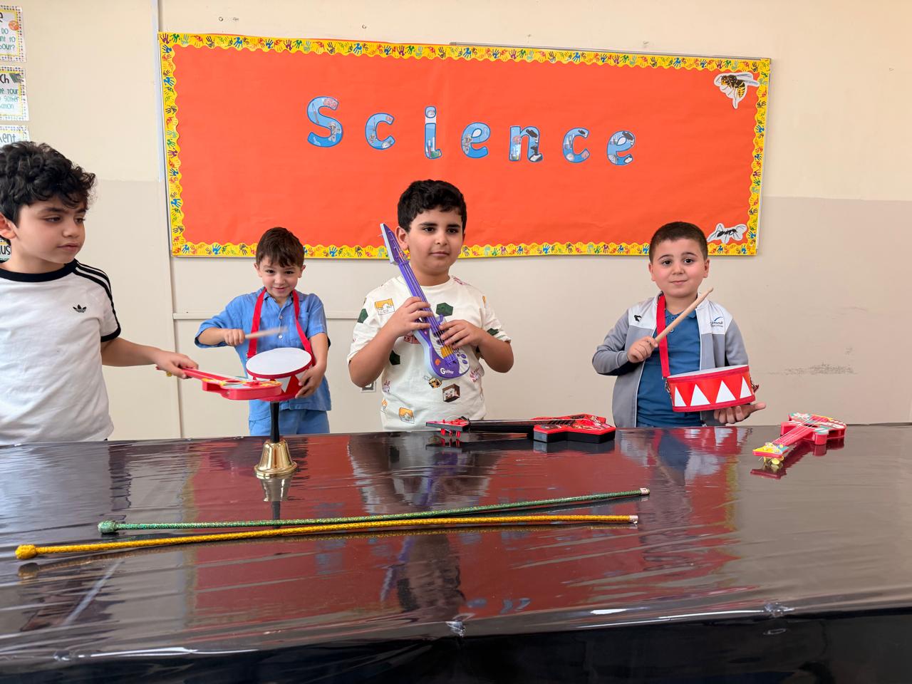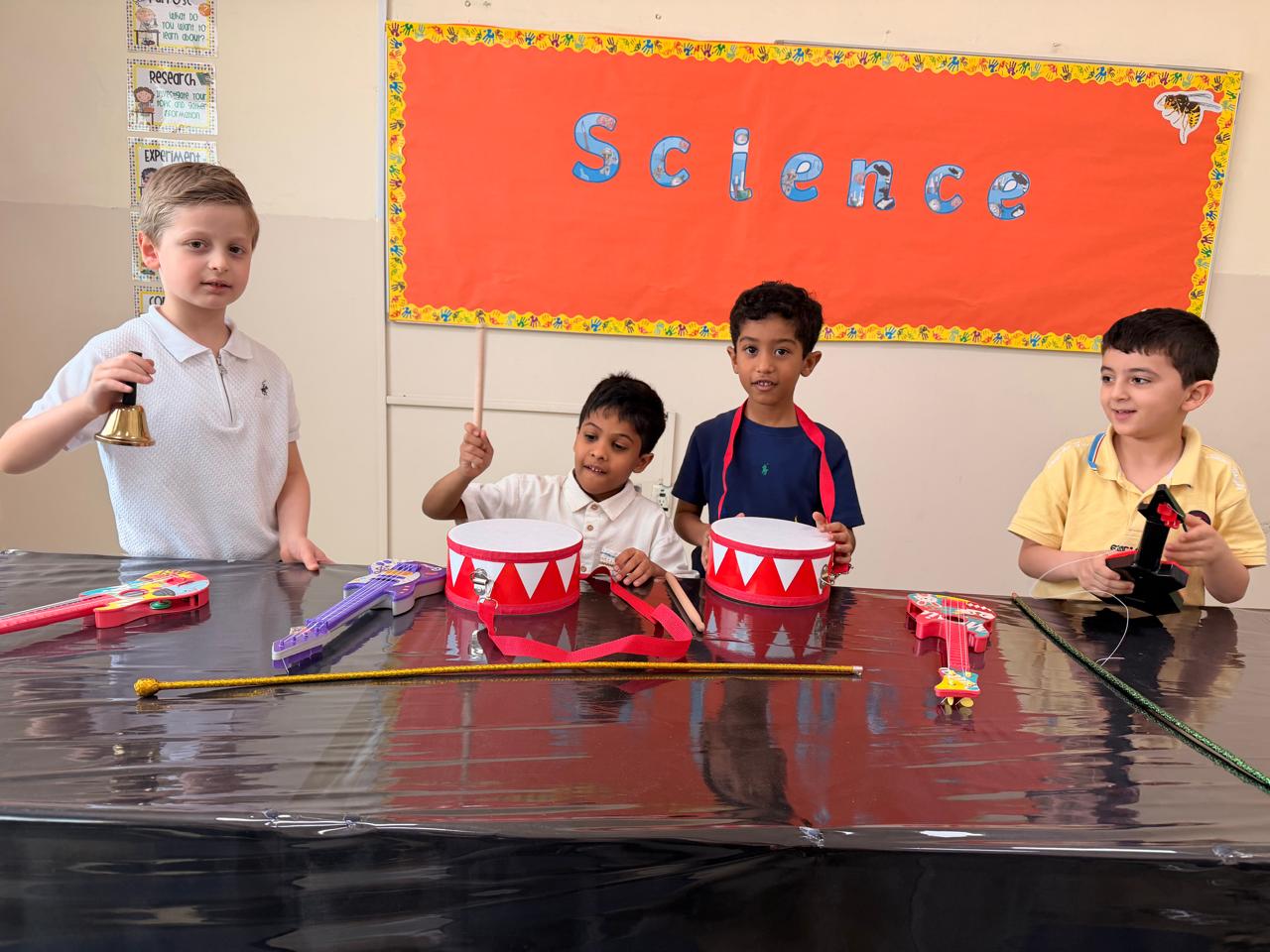 Orbit International School Grade 1 students play with musical instruments to discover different types of sounds