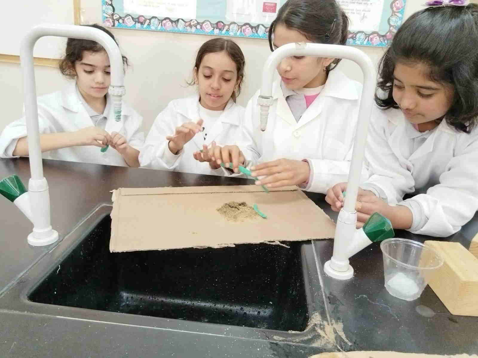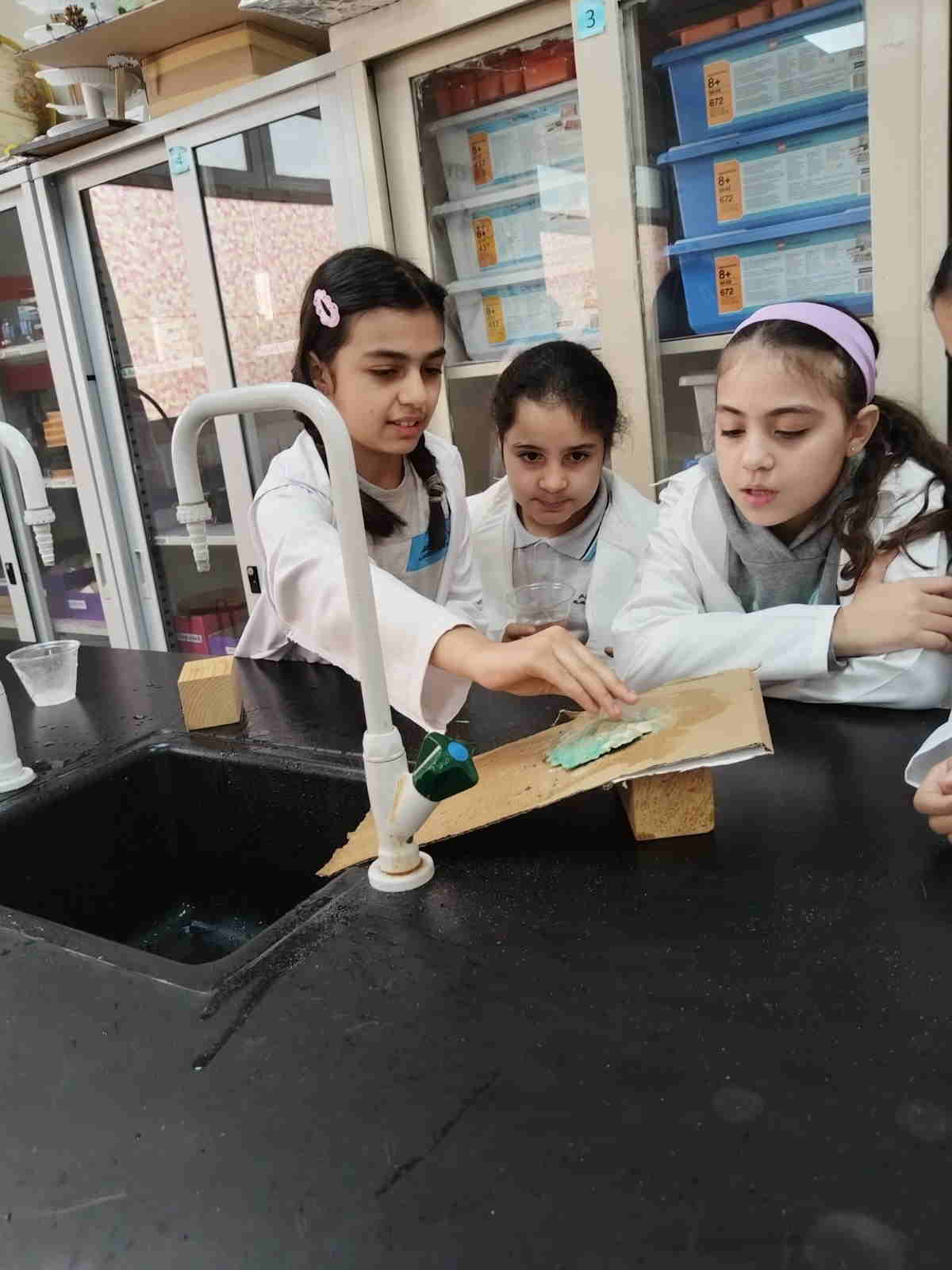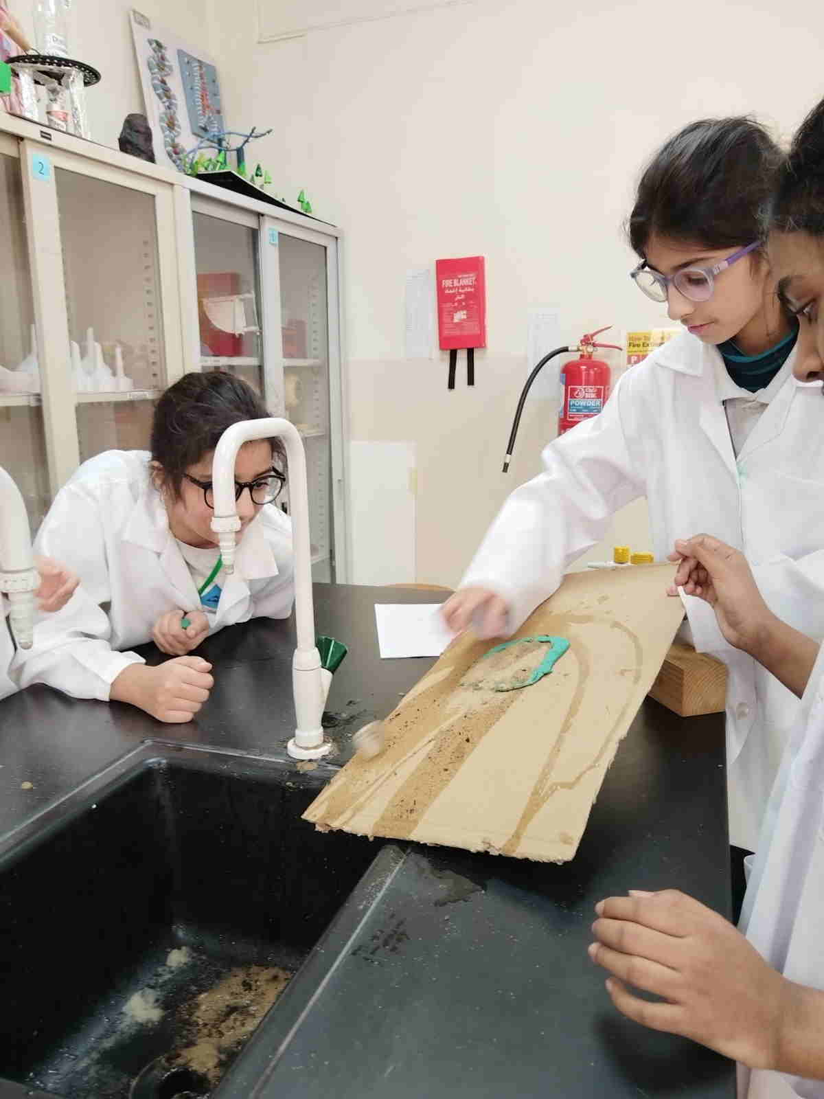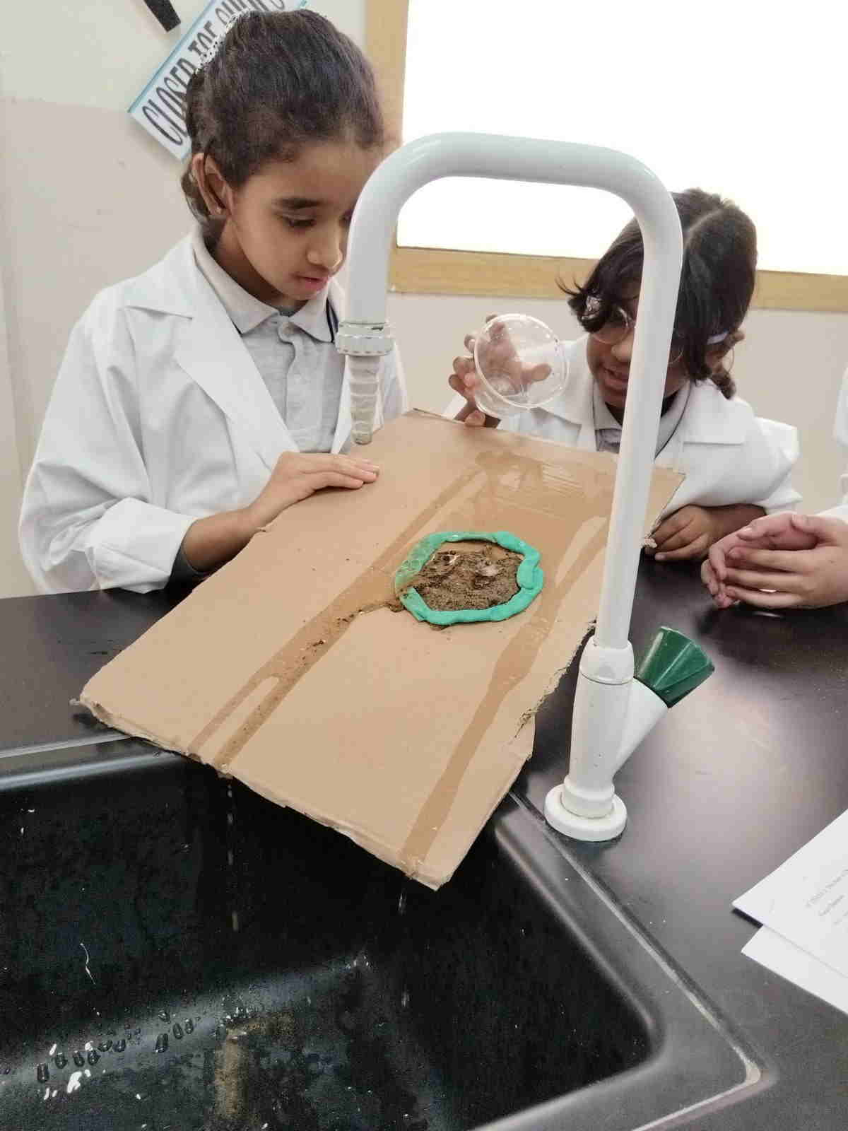 Grade 4 girls from Orbit International School explored erosion by pouring water over a small “landform” made of soil on cardboard and using ice to represent glaciers. As the water flowed and the ice moved, they observed how soil was carried away and how the shape of the land slowly changed.