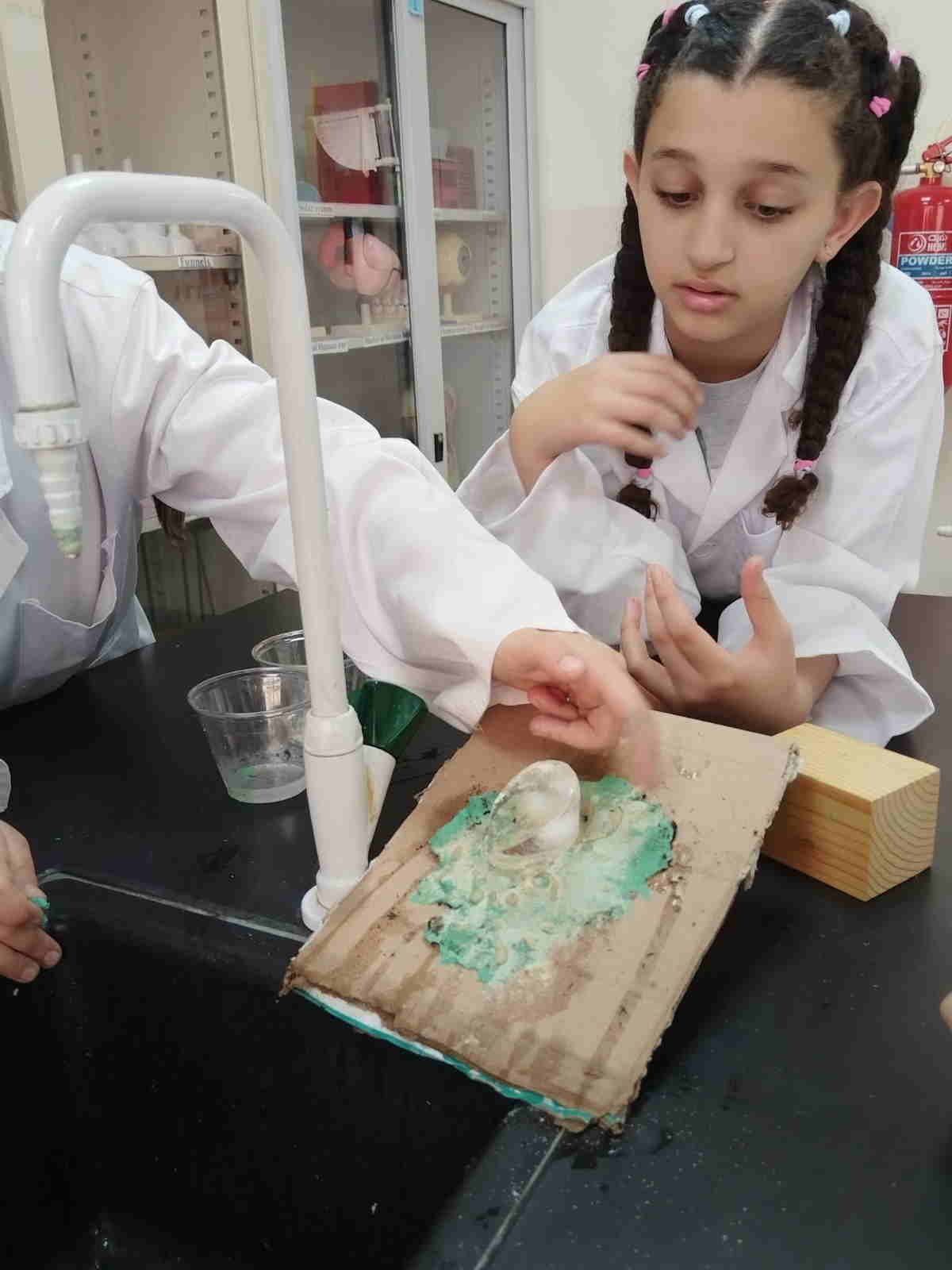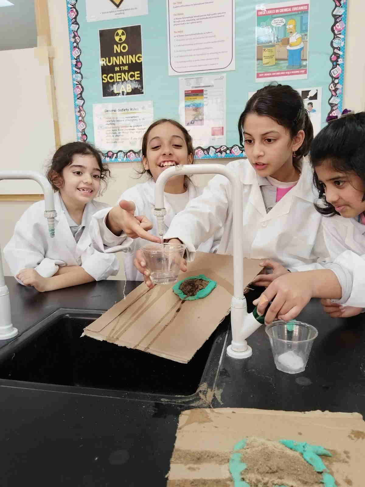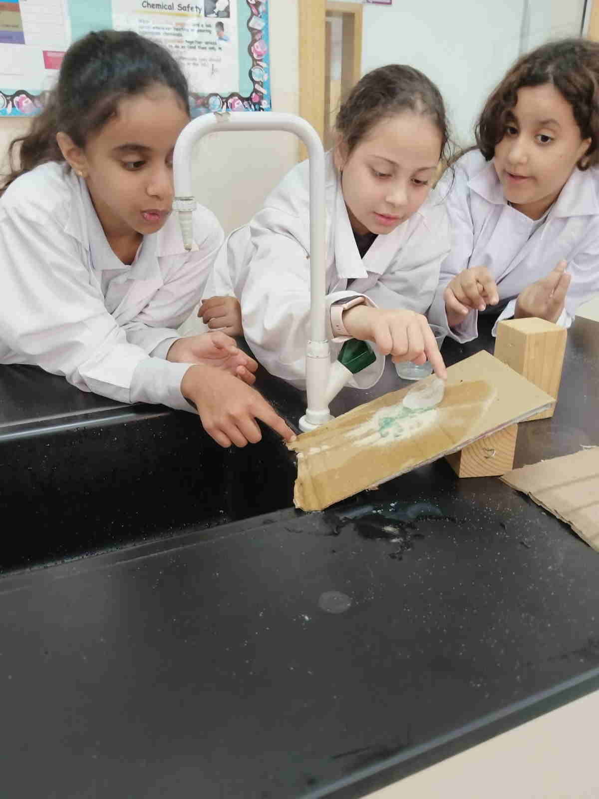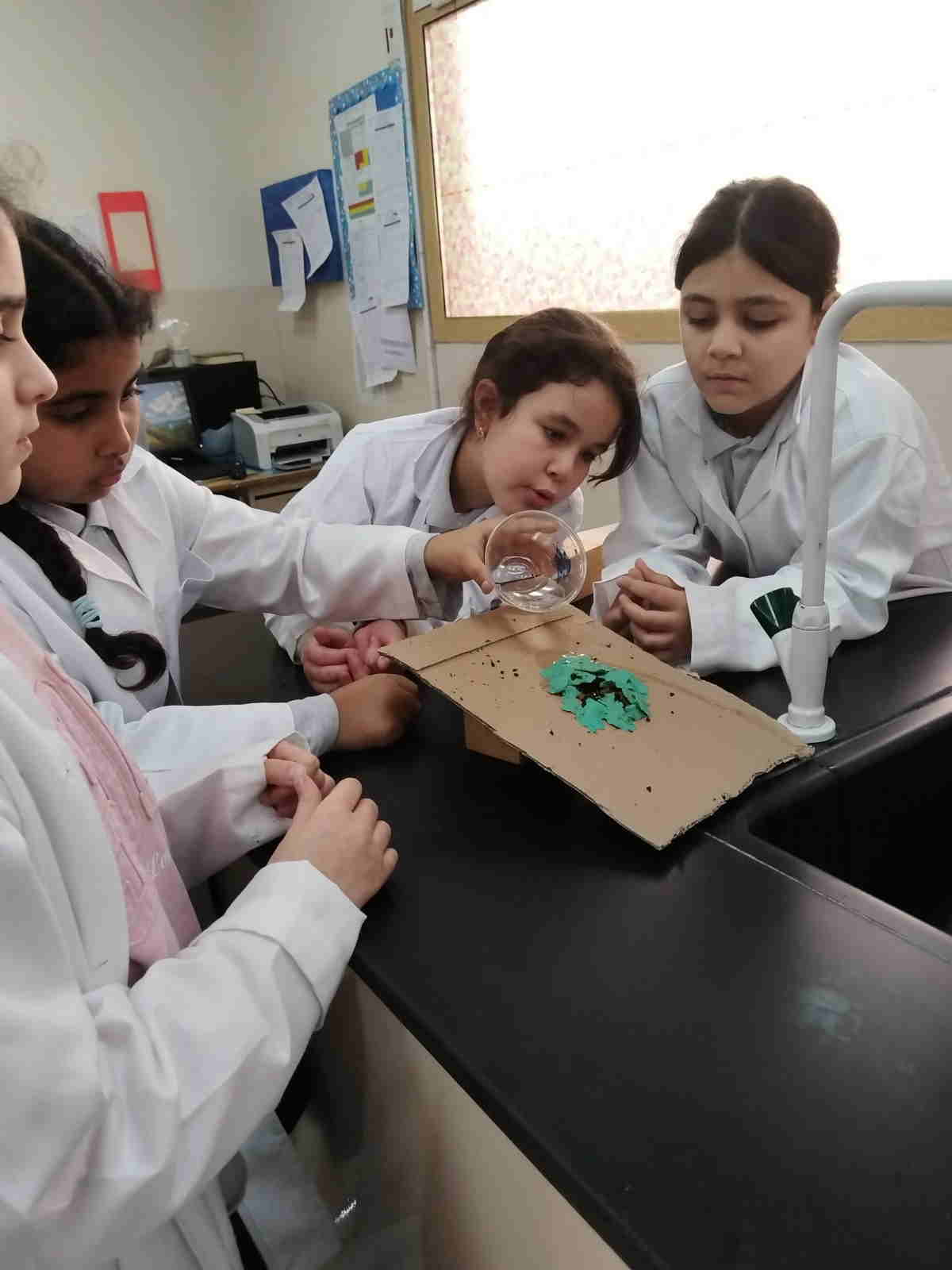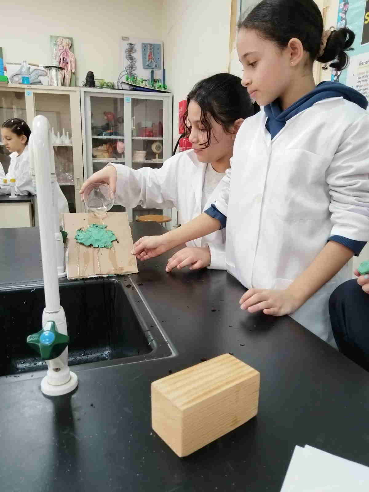 Grade 4 girls from Orbit International School explored erosion by pouring water over a small “landform” made of soil on cardboard and using ice to represent glaciers. As the water flowed and the ice moved, they observed how soil was carried away and how the shape of the land slowly changed.