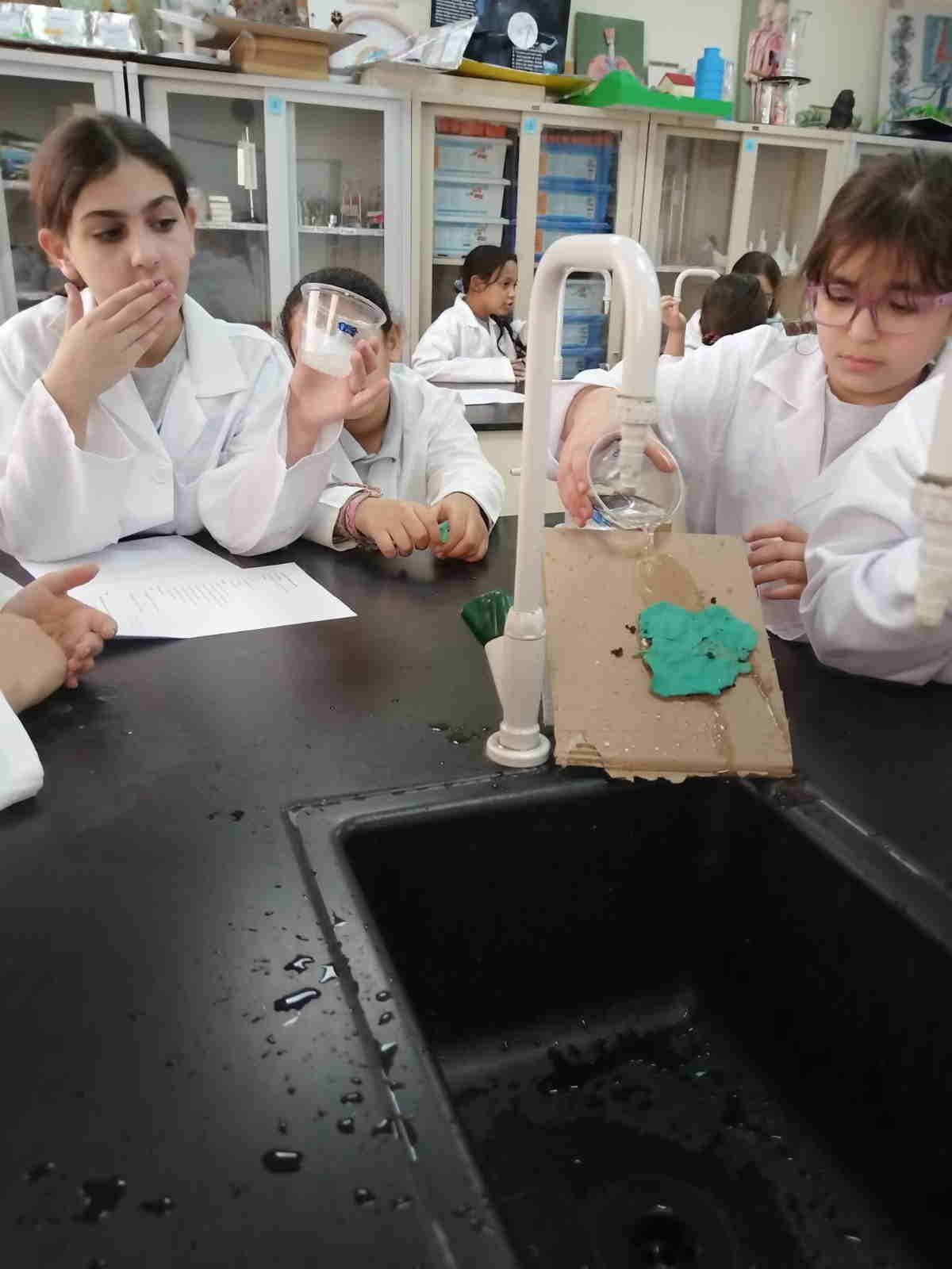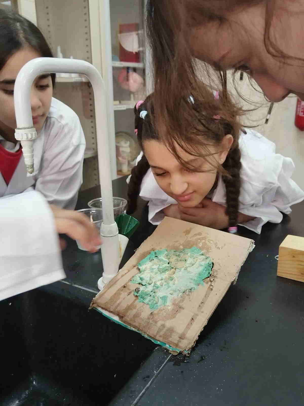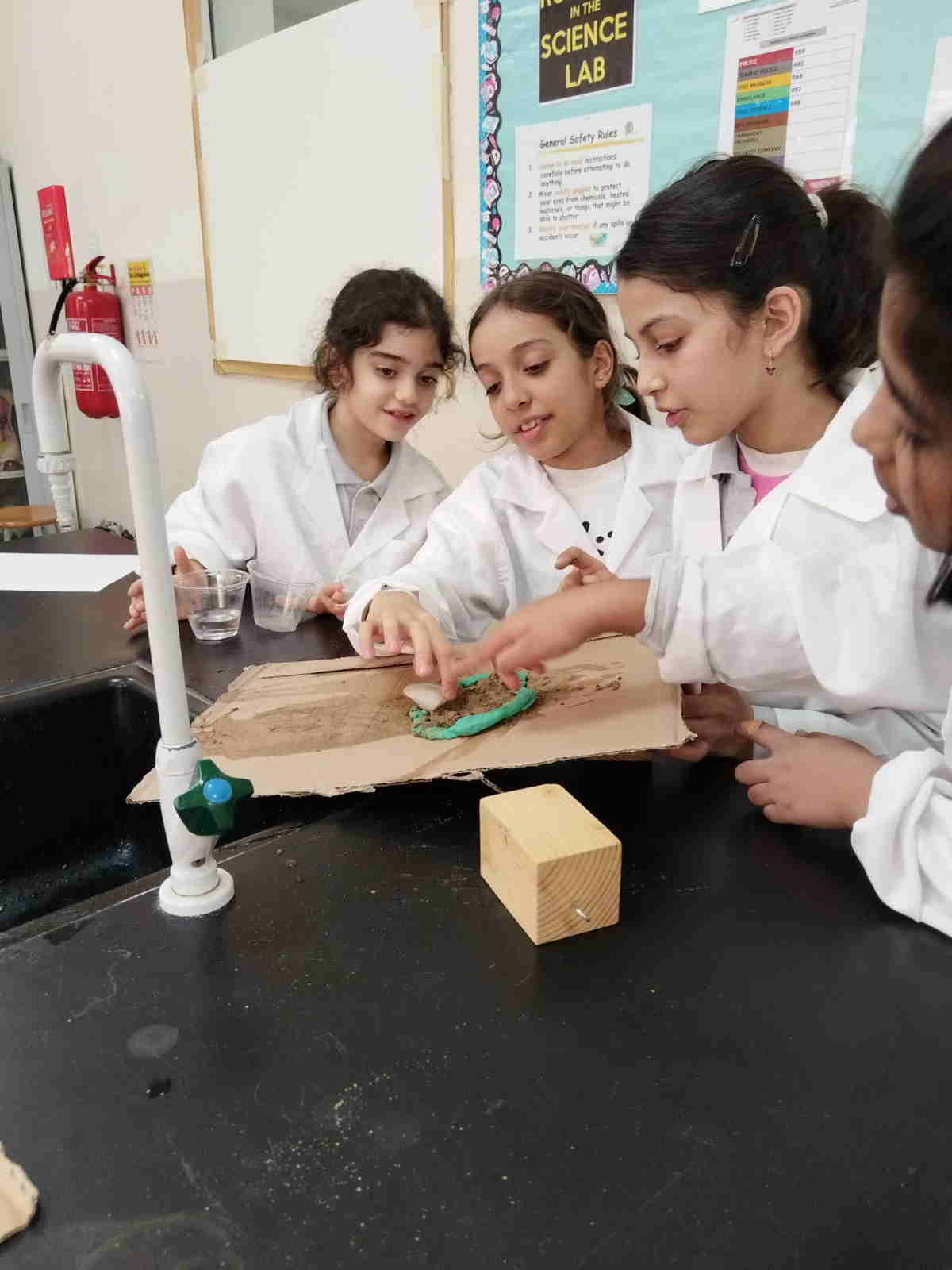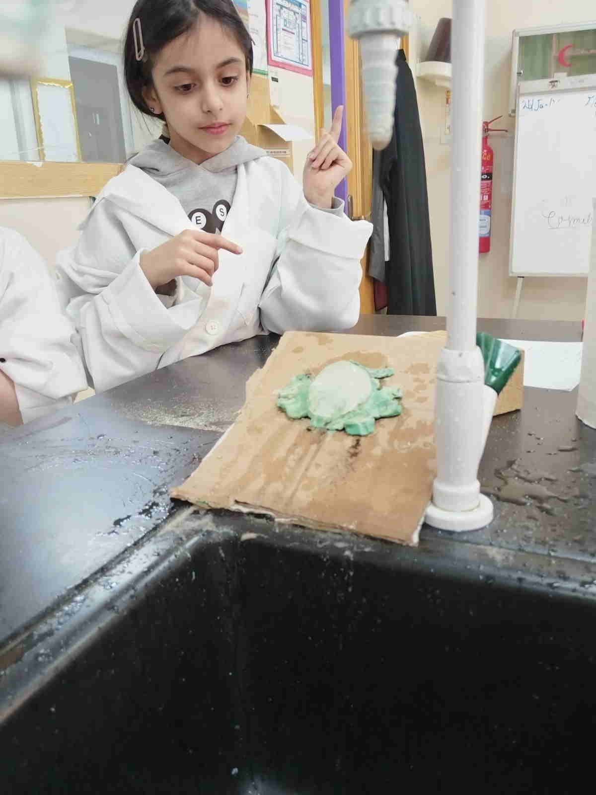 Grade 4 girls from Orbit International School explored erosion by pouring water over a small “landform” made of soil on cardboard and using ice to represent glaciers. As the water flowed and the ice moved, they observed how soil was carried away and how the shape of the land slowly changed.