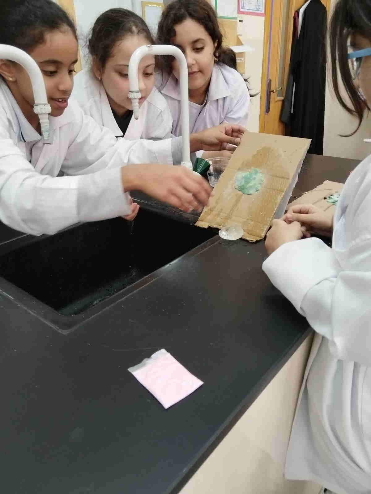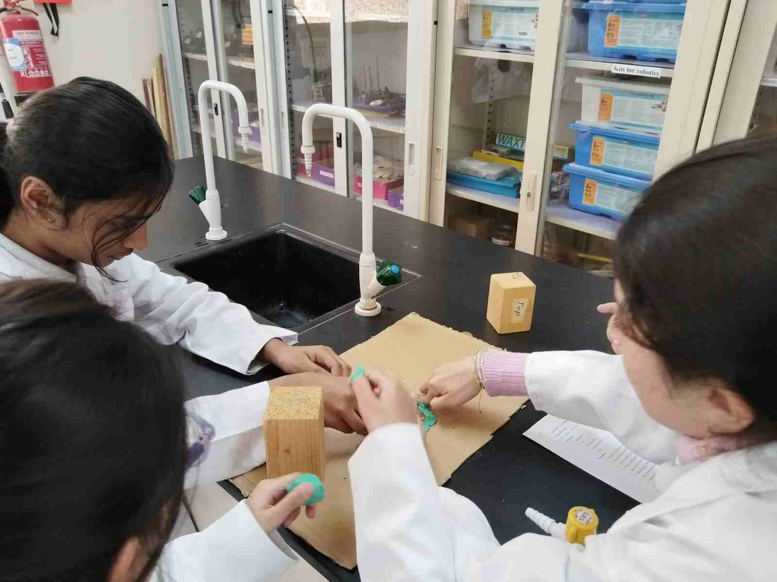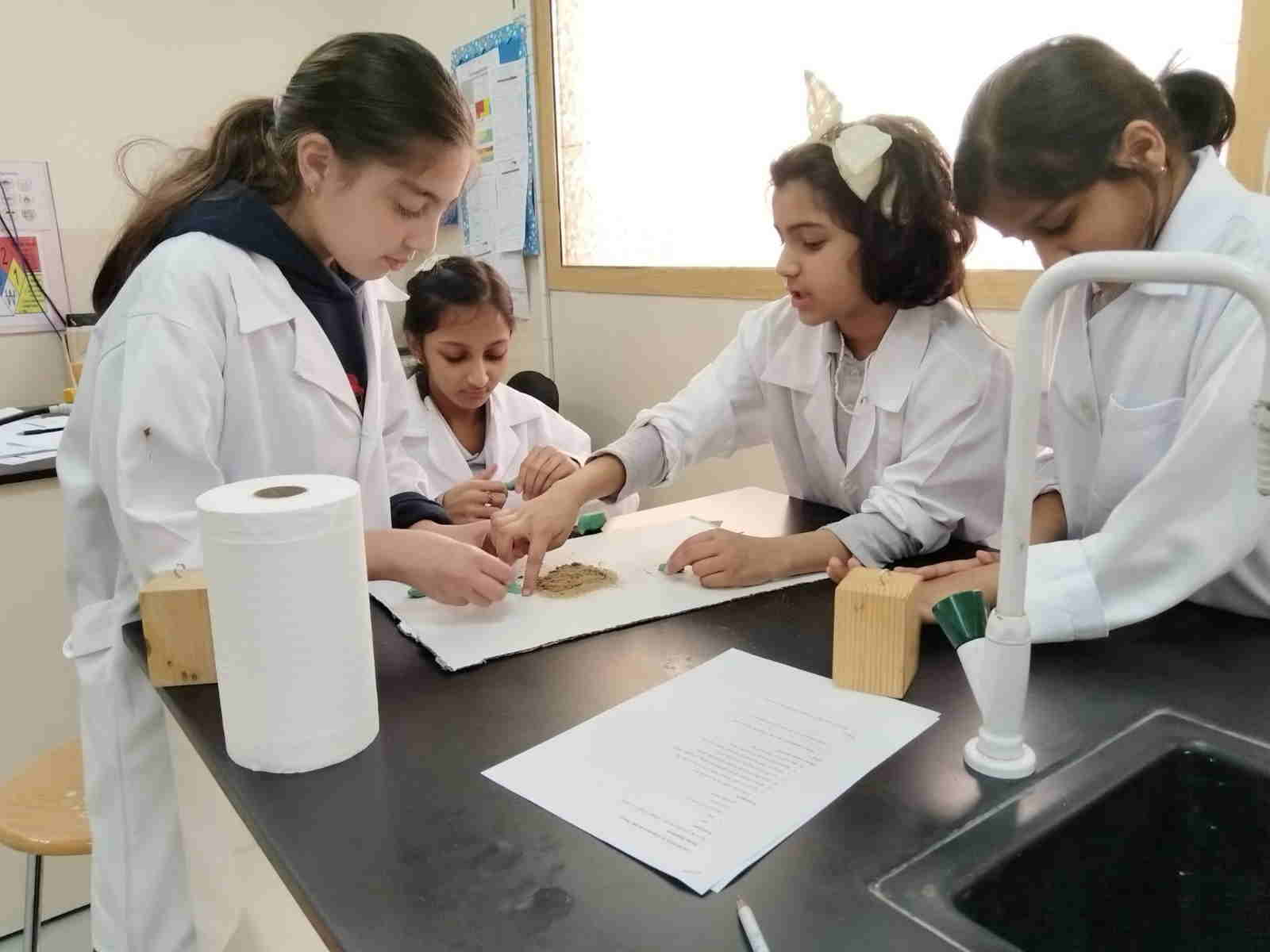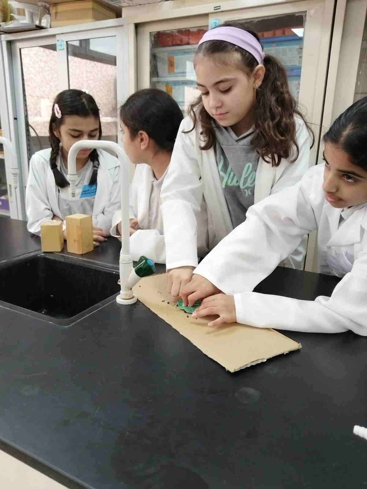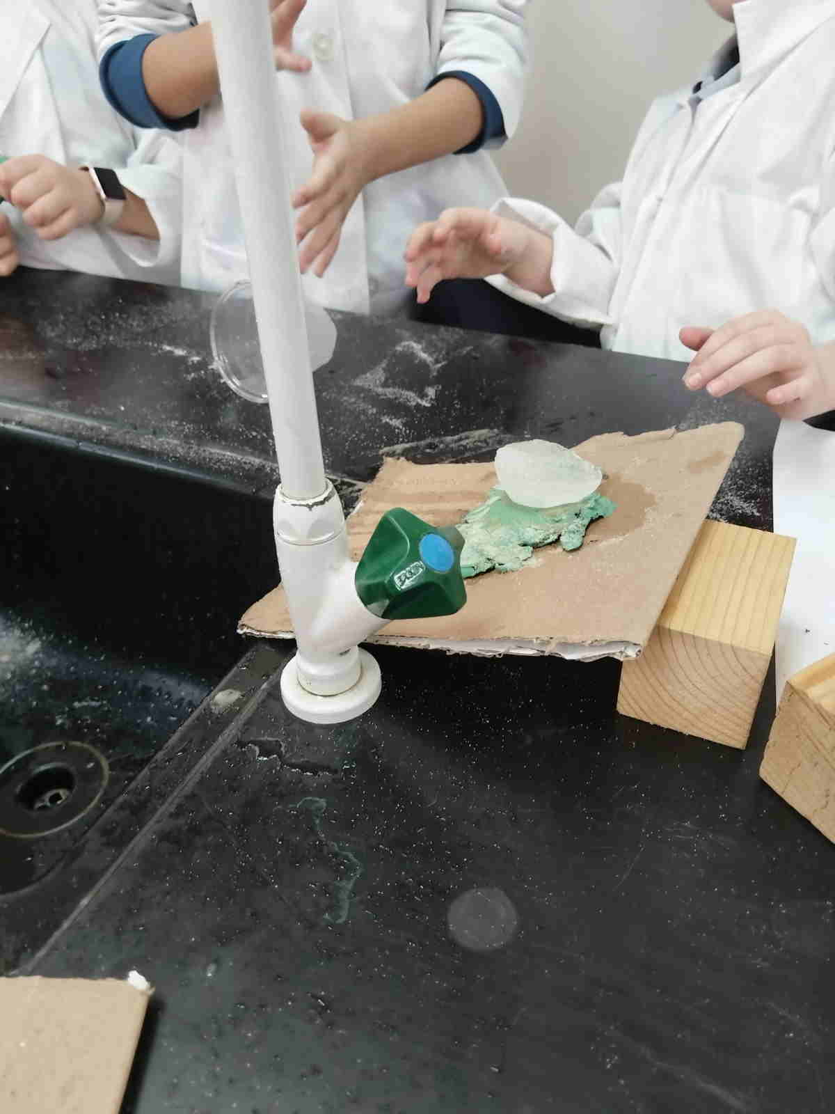 Grade 4 girls from Orbit International School explored erosion by pouring water over a small “landform” made of soil on cardboard and using ice to represent glaciers. As the water flowed and the ice moved, they observed how soil was carried away and how the shape of the land slowly changed.