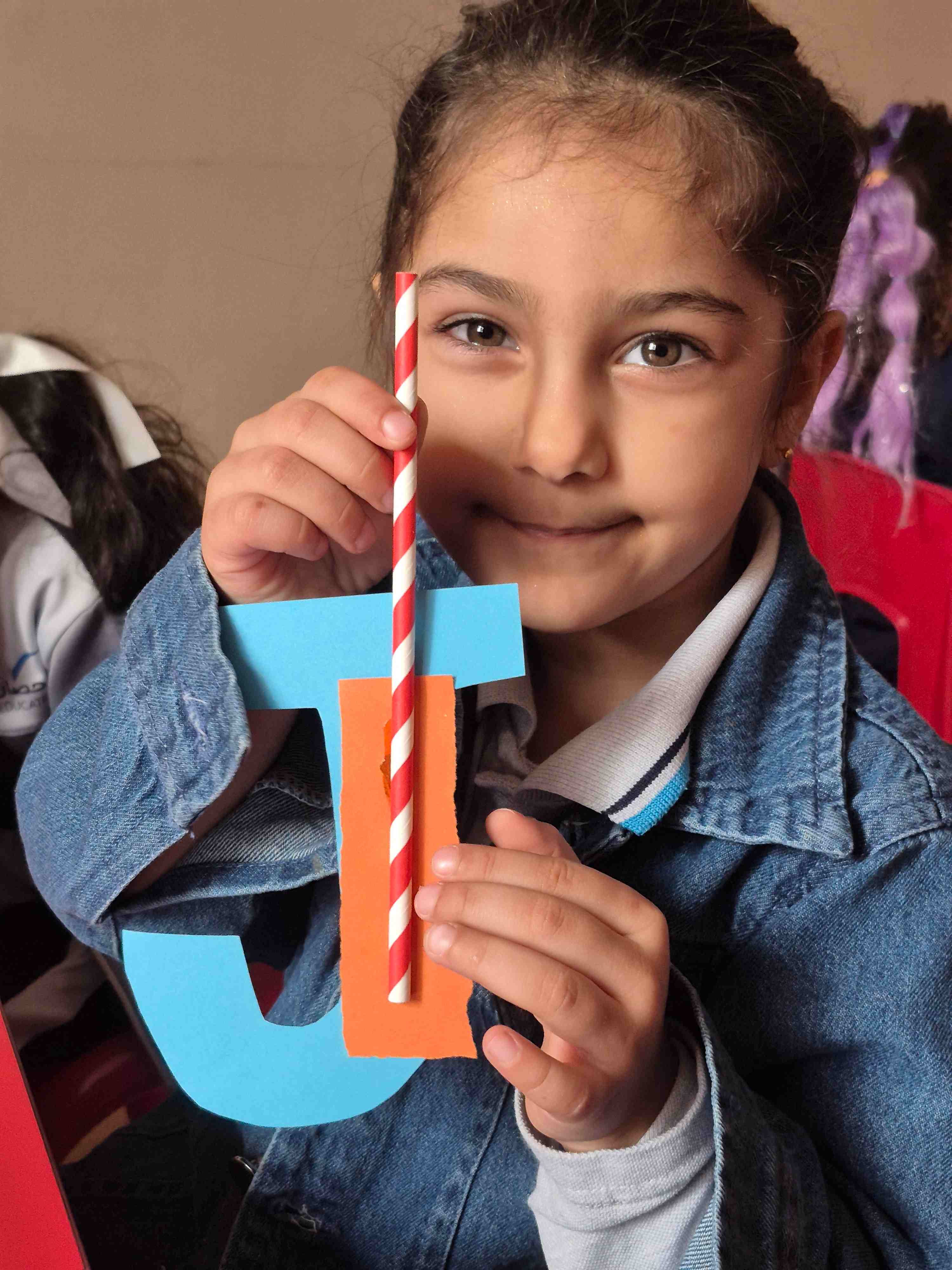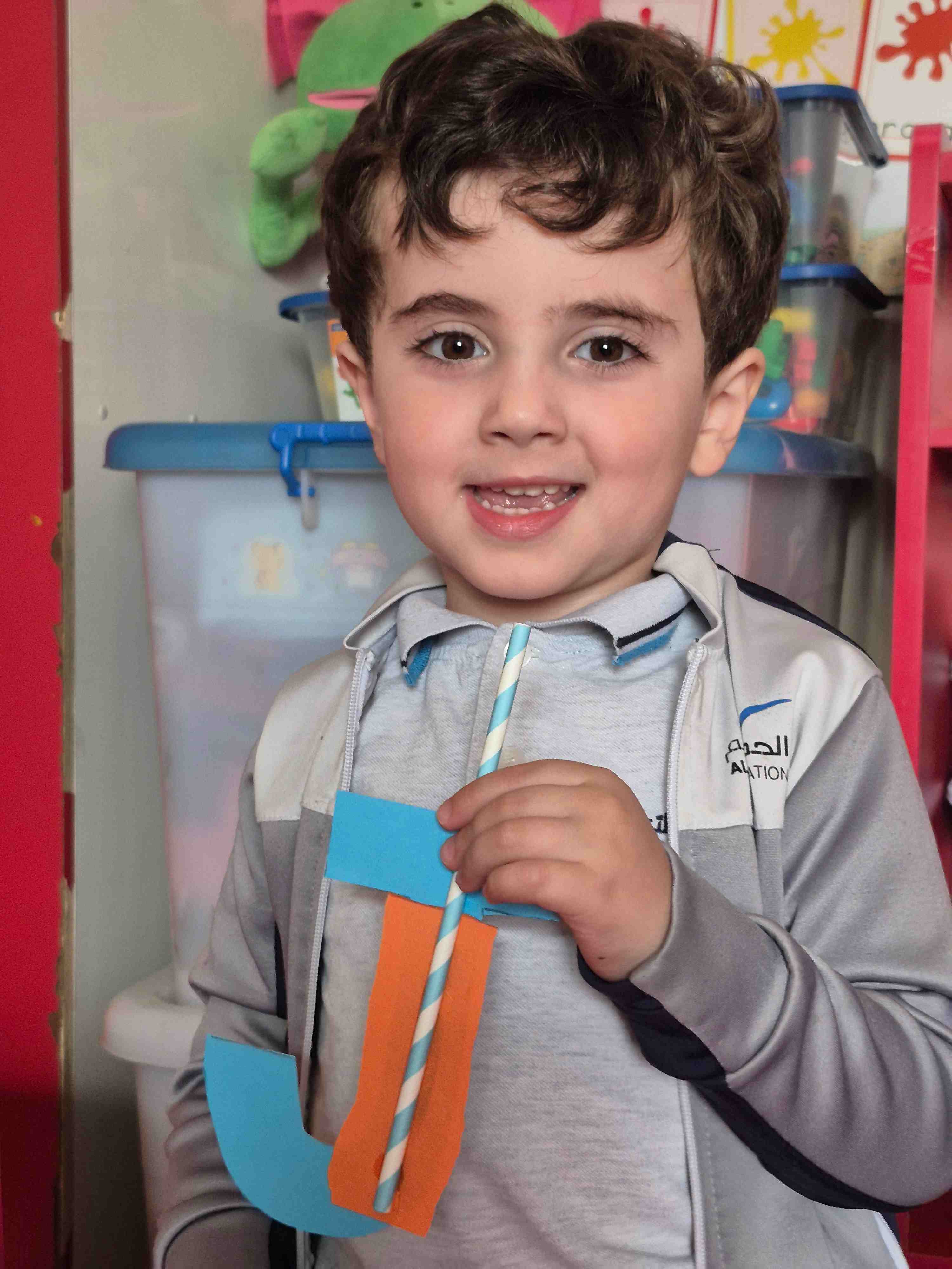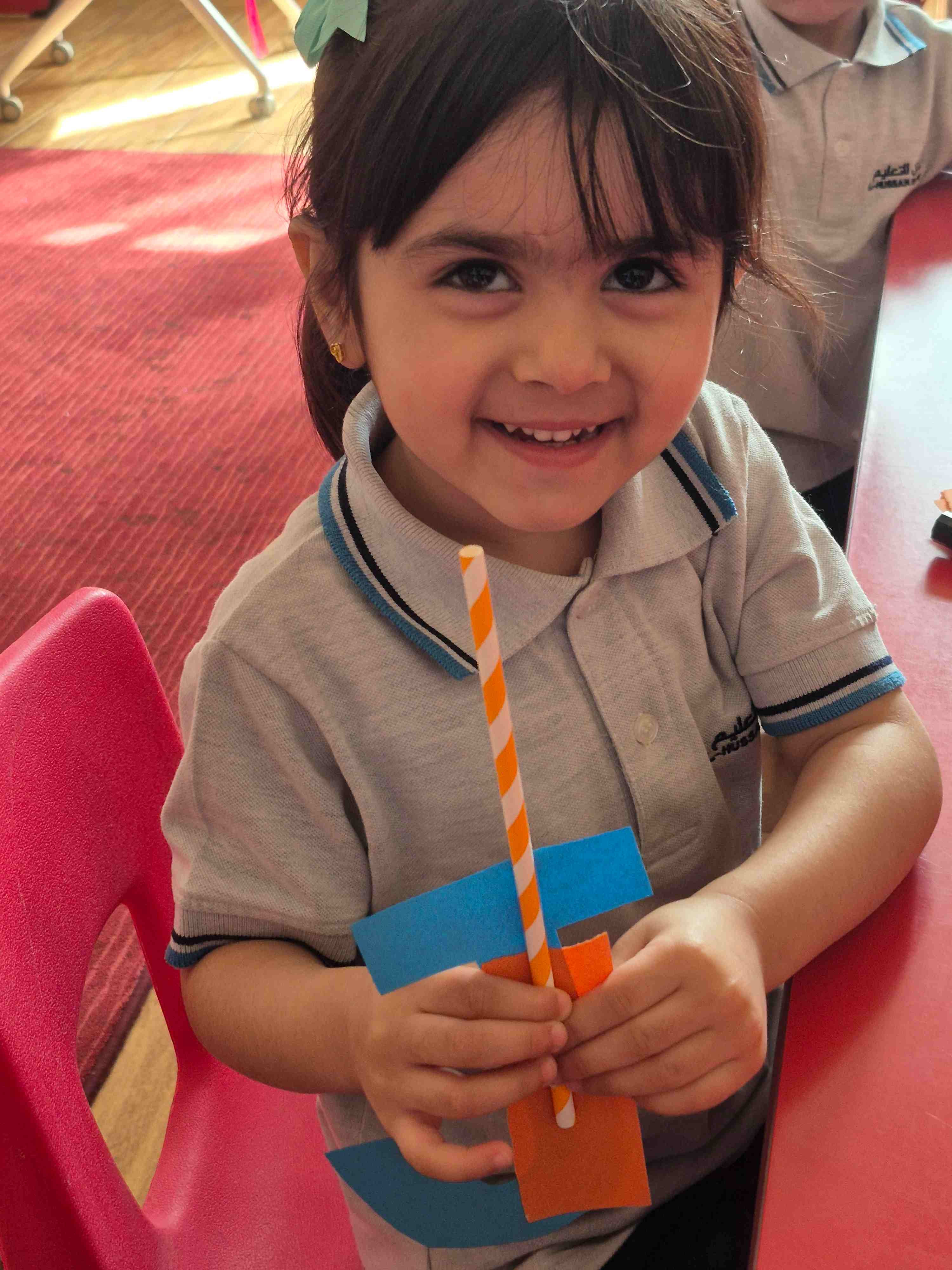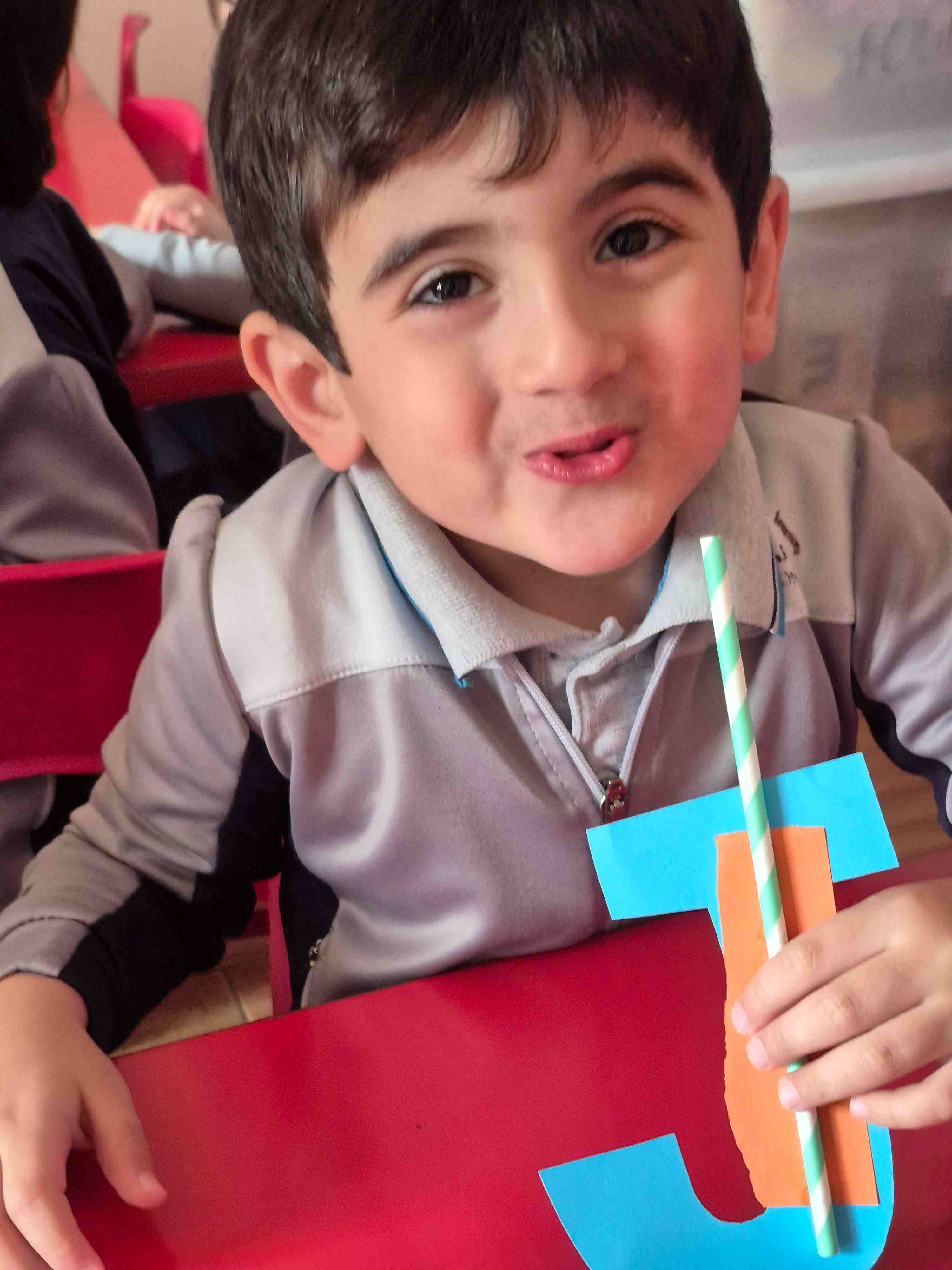 KG 1 student at AL Hussan International School – Riyadh created a fun craft to learn the letter J. Each student was given a large cut-out of the letter J and small pieces of orange colored paper. They carefully teared and pasted the orange paper onto the letter to decorate it. A straw is then glued onto the J to add a creative touch, helping students explore different materials. This activity supports letter recognition, creativity, and fine motor skills while making learning enjoyable and hands-on.