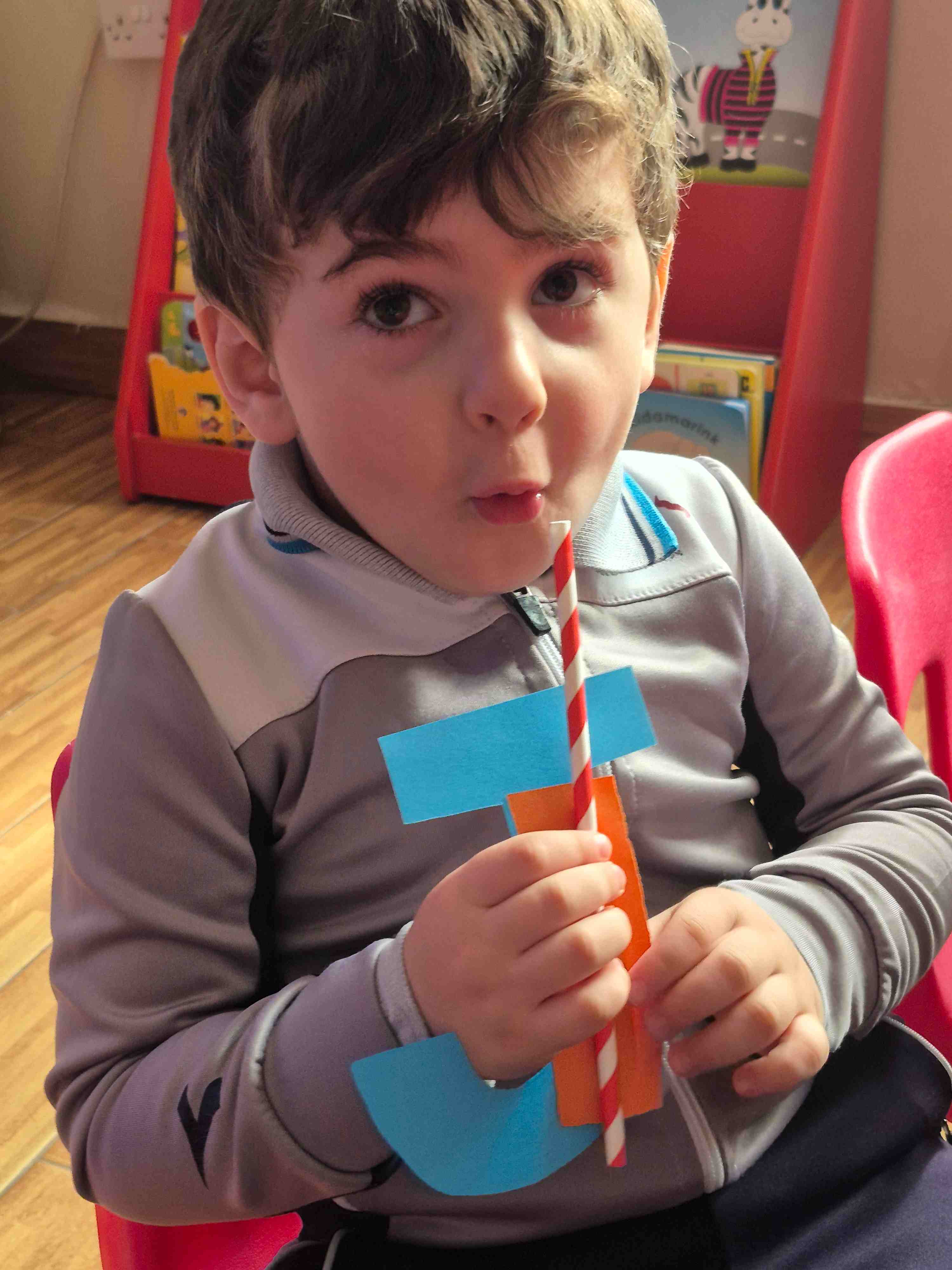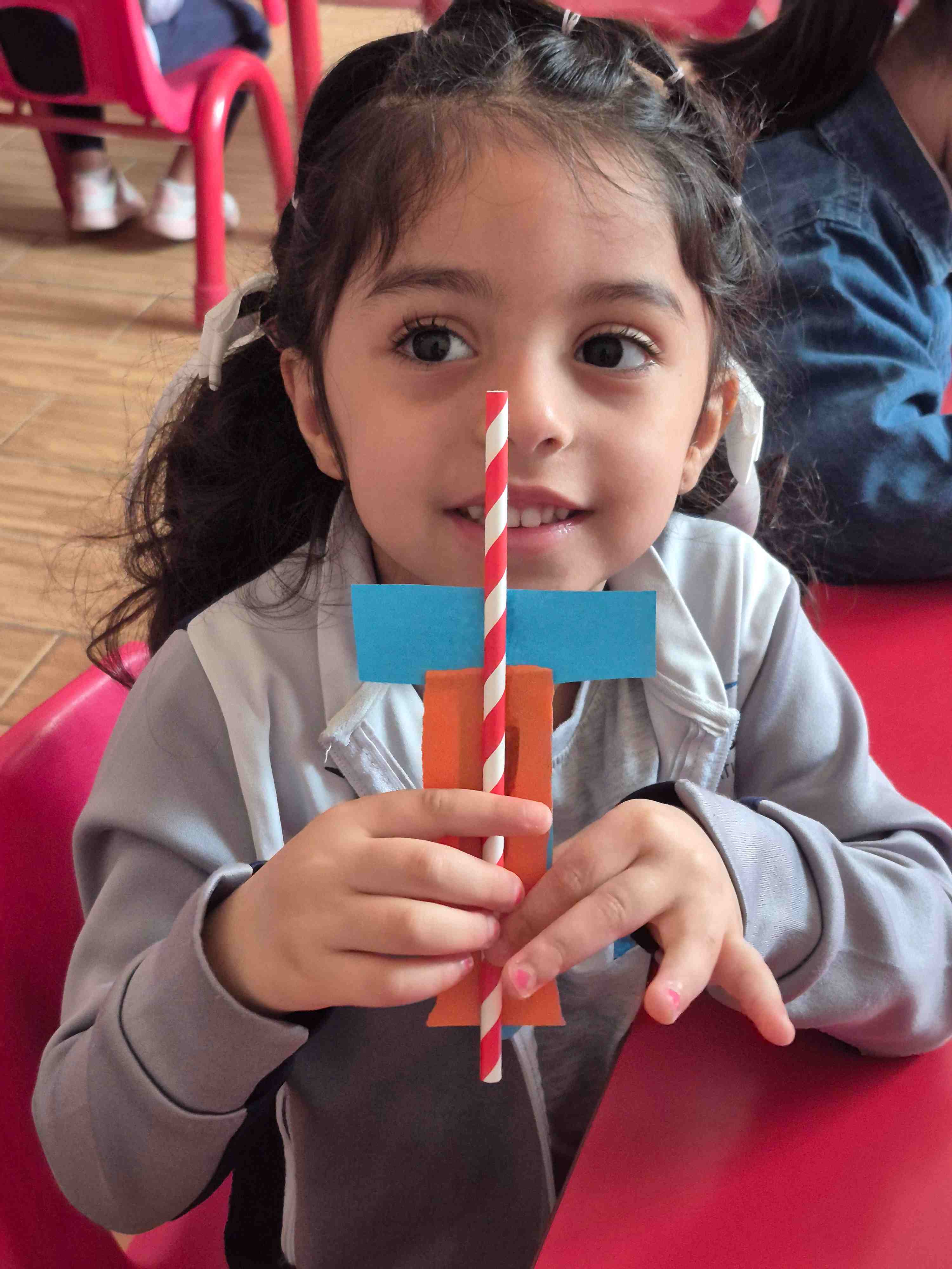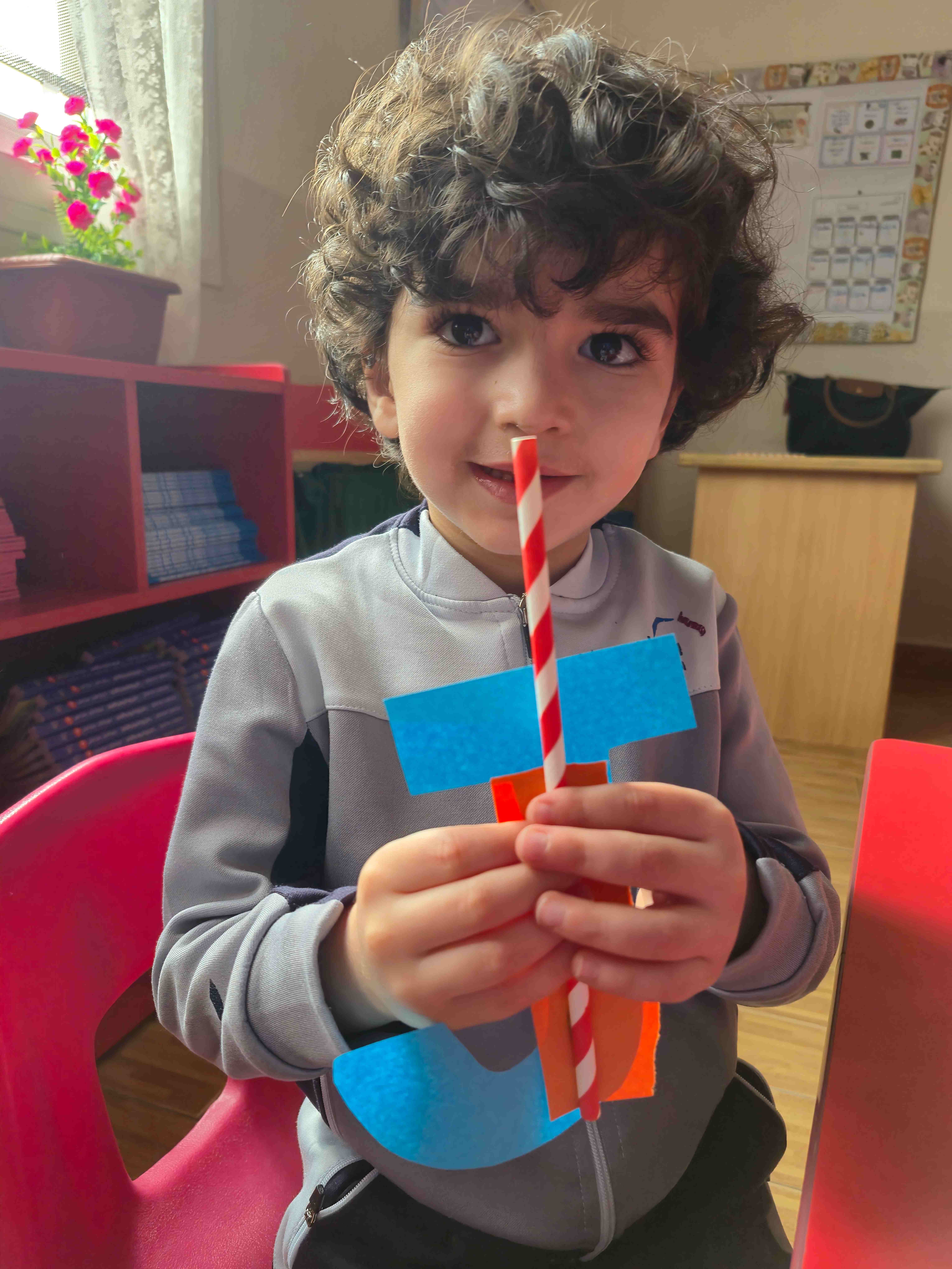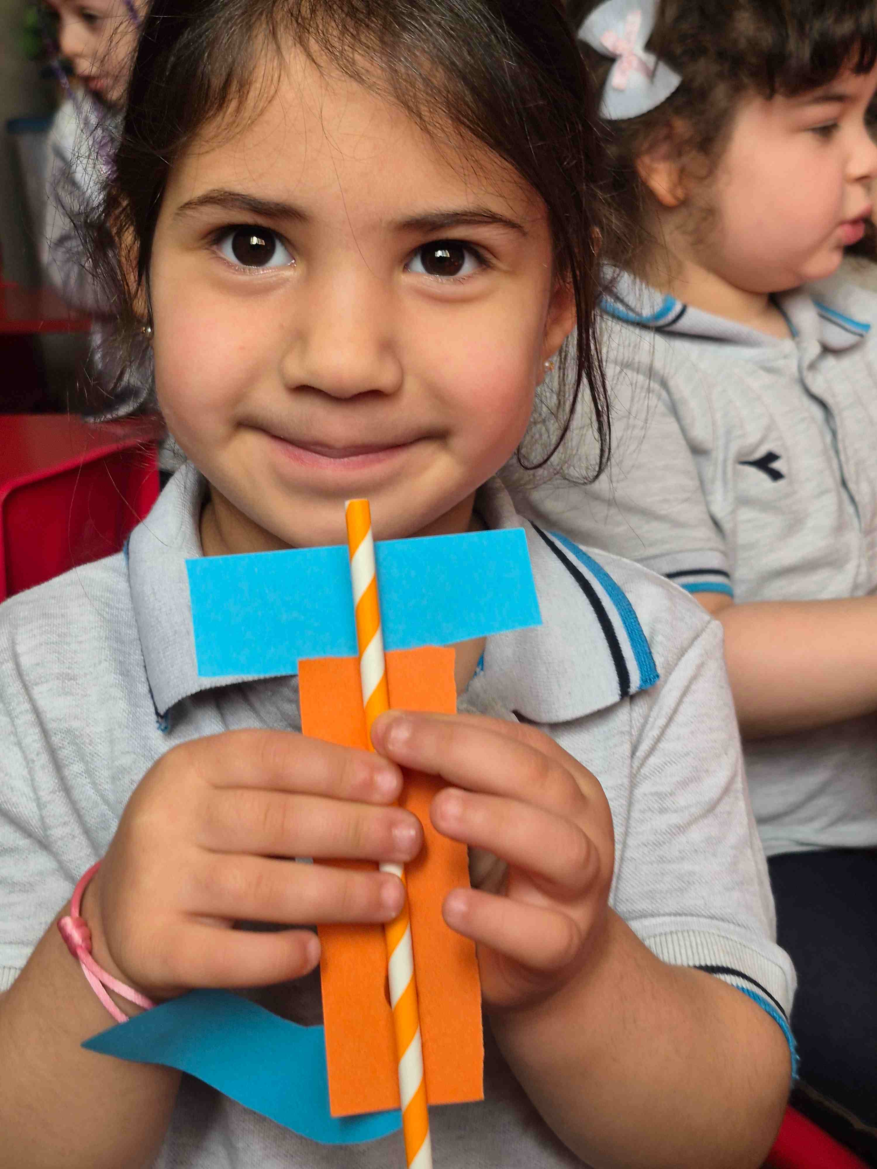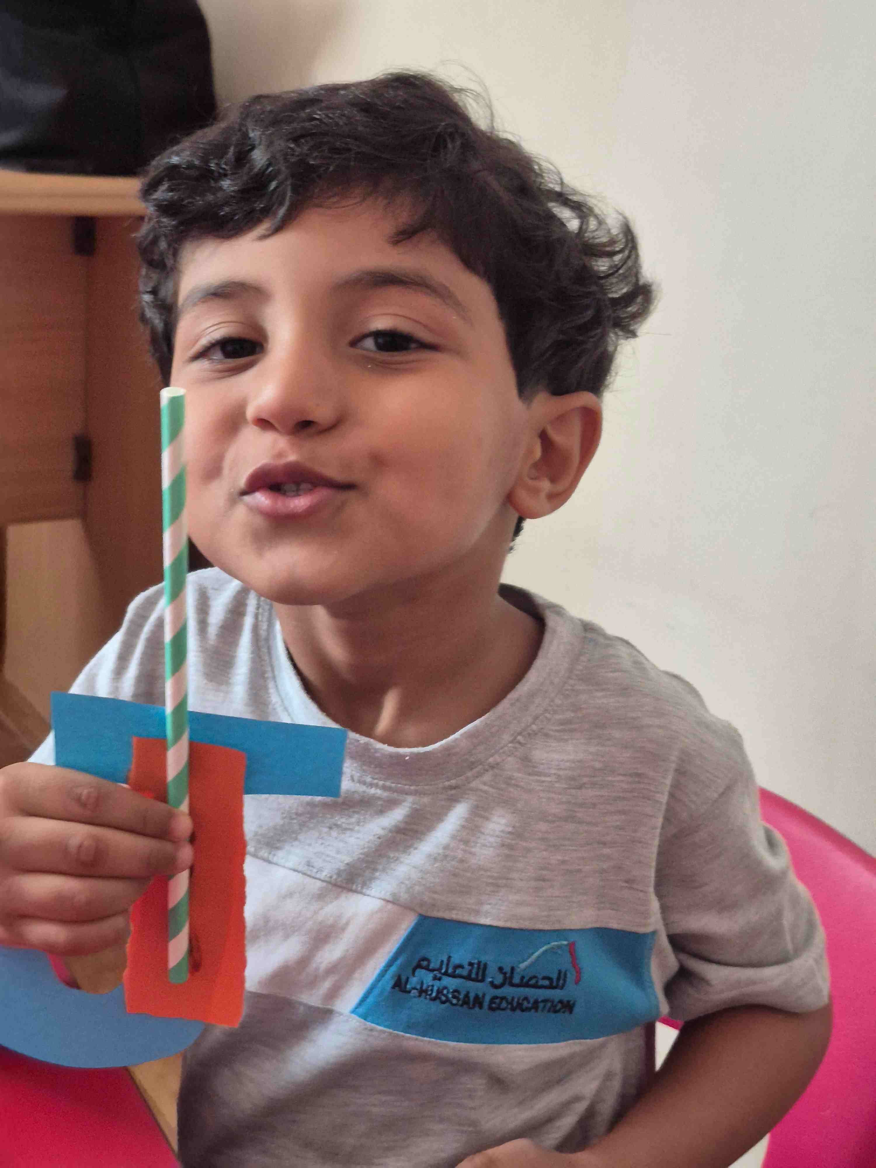 KG 1 student at AL Hussan International School – Riyadh created a fun craft to learn the letter J. Each student was given a large cut-out of the letter J and small pieces of orange colored paper. They carefully teared and pasted the orange paper onto the letter to decorate it. A straw is then glued onto the J to add a creative touch, helping students explore different materials. This activity supports letter recognition, creativity, and fine motor skills while making learning enjoyable and hands-on.