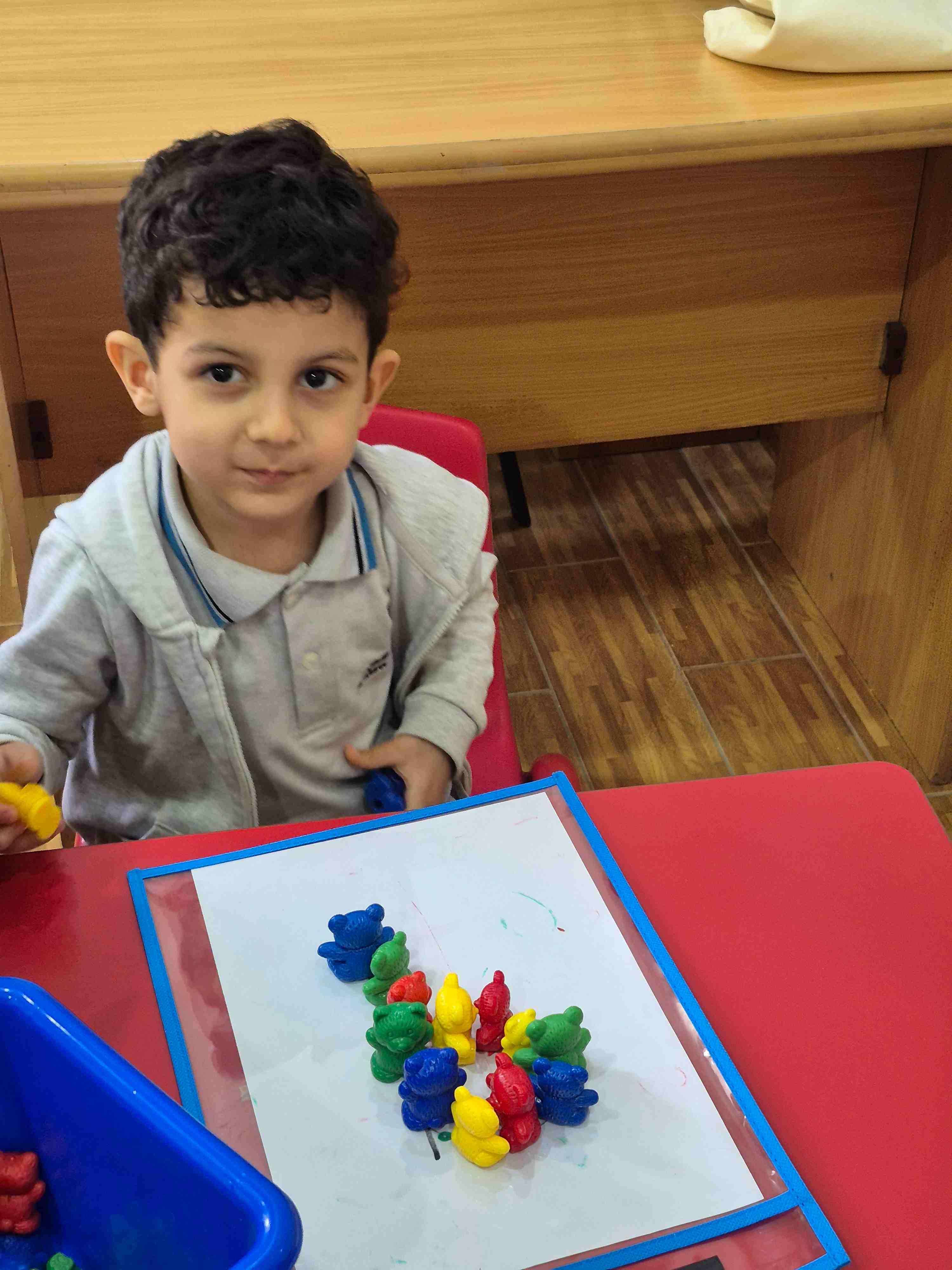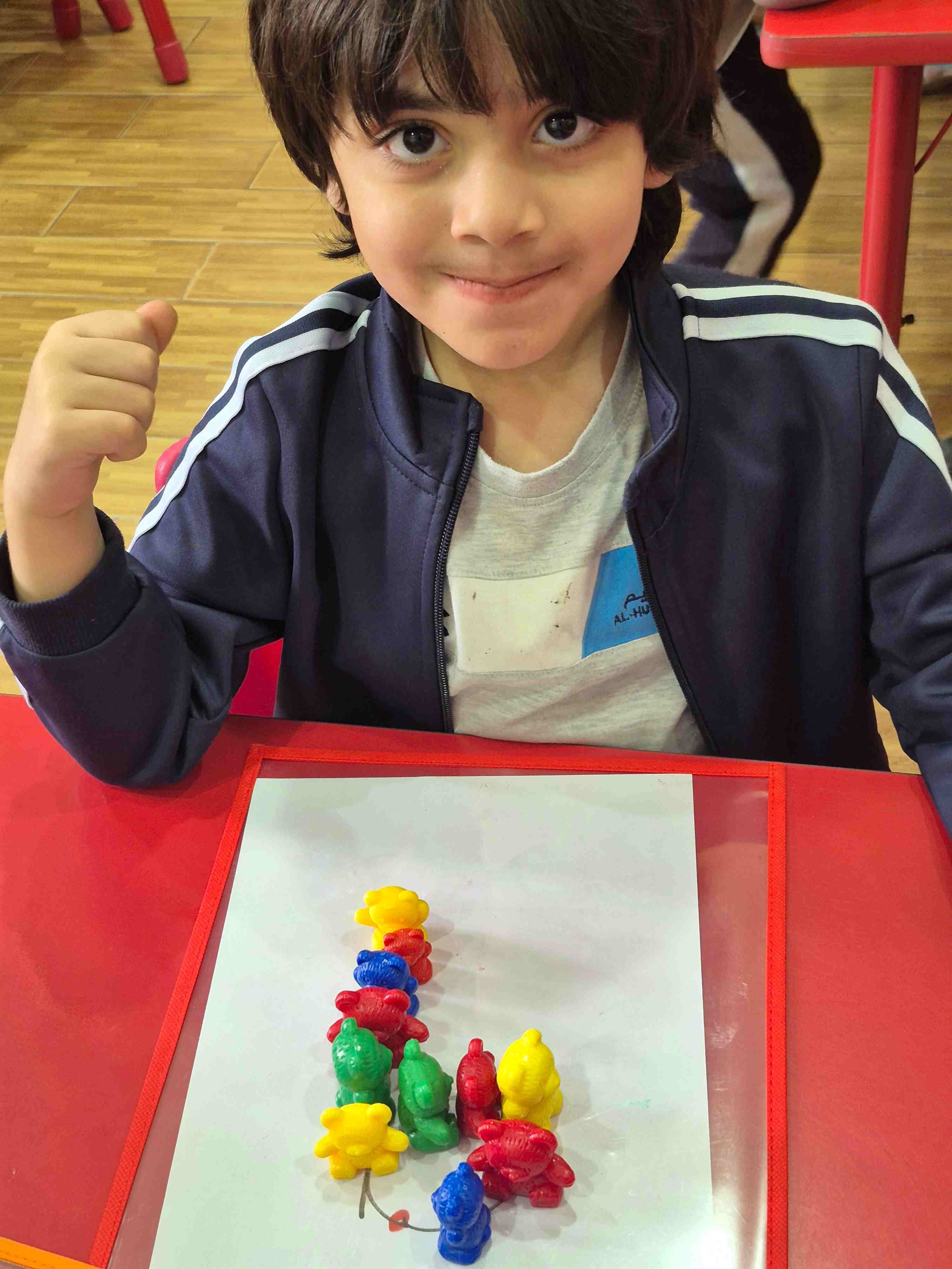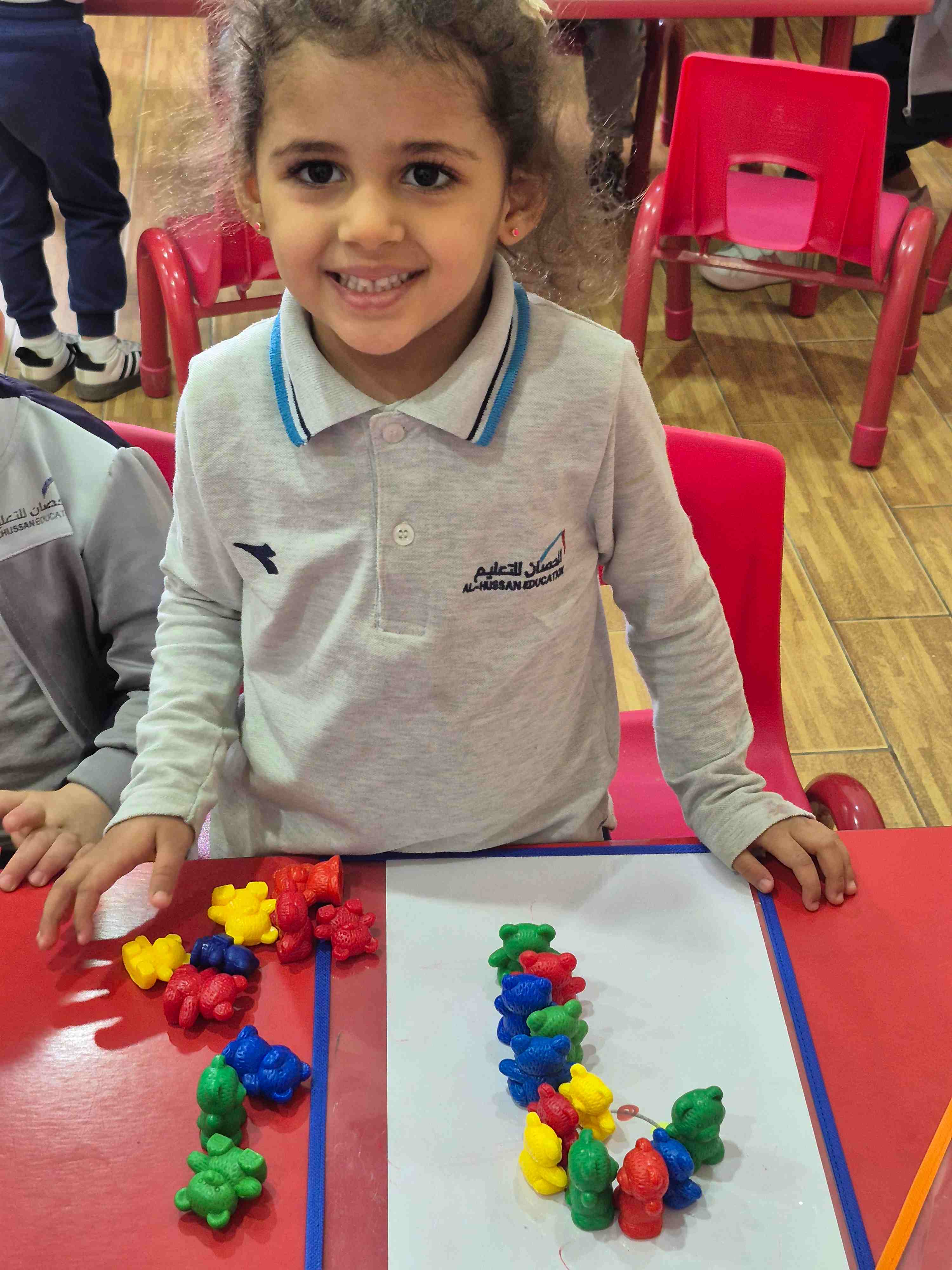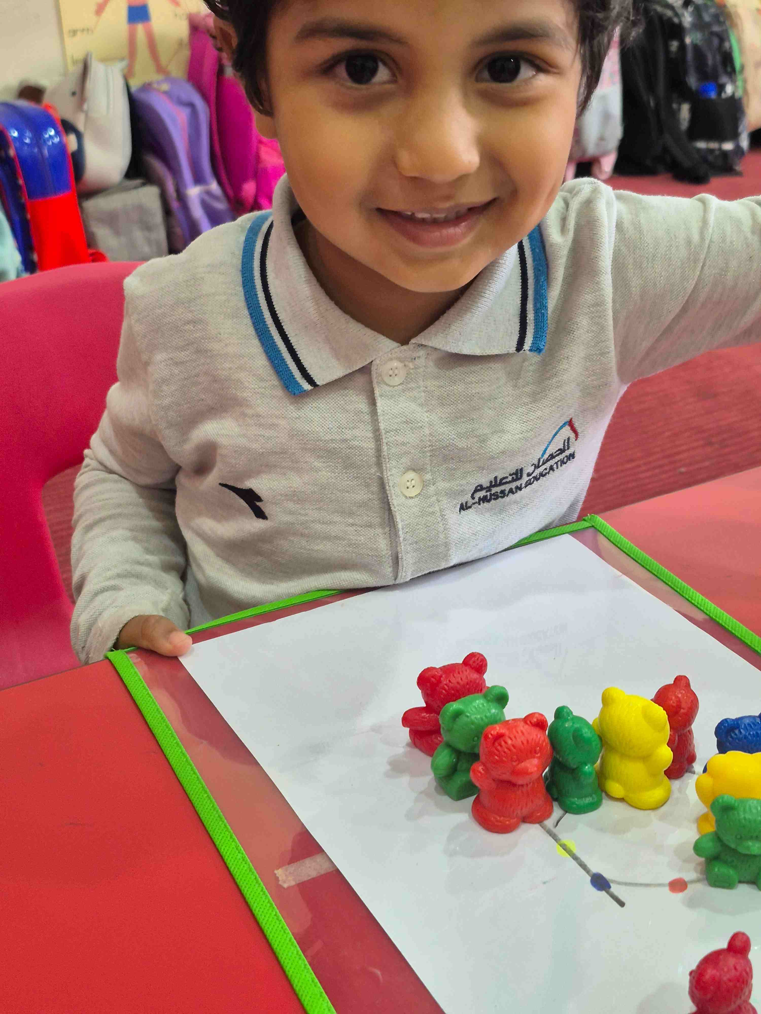 KG1 students at AlHussan International School -Riyadh practiced recognizing the number 9 by placing colored teddy bears on a number nine drawing. Each teddy bear was matched and placed according to the colored dots aligned on the number. This activity helped children with number recognition, color matching, and improved their fine motor skills through careful placement.