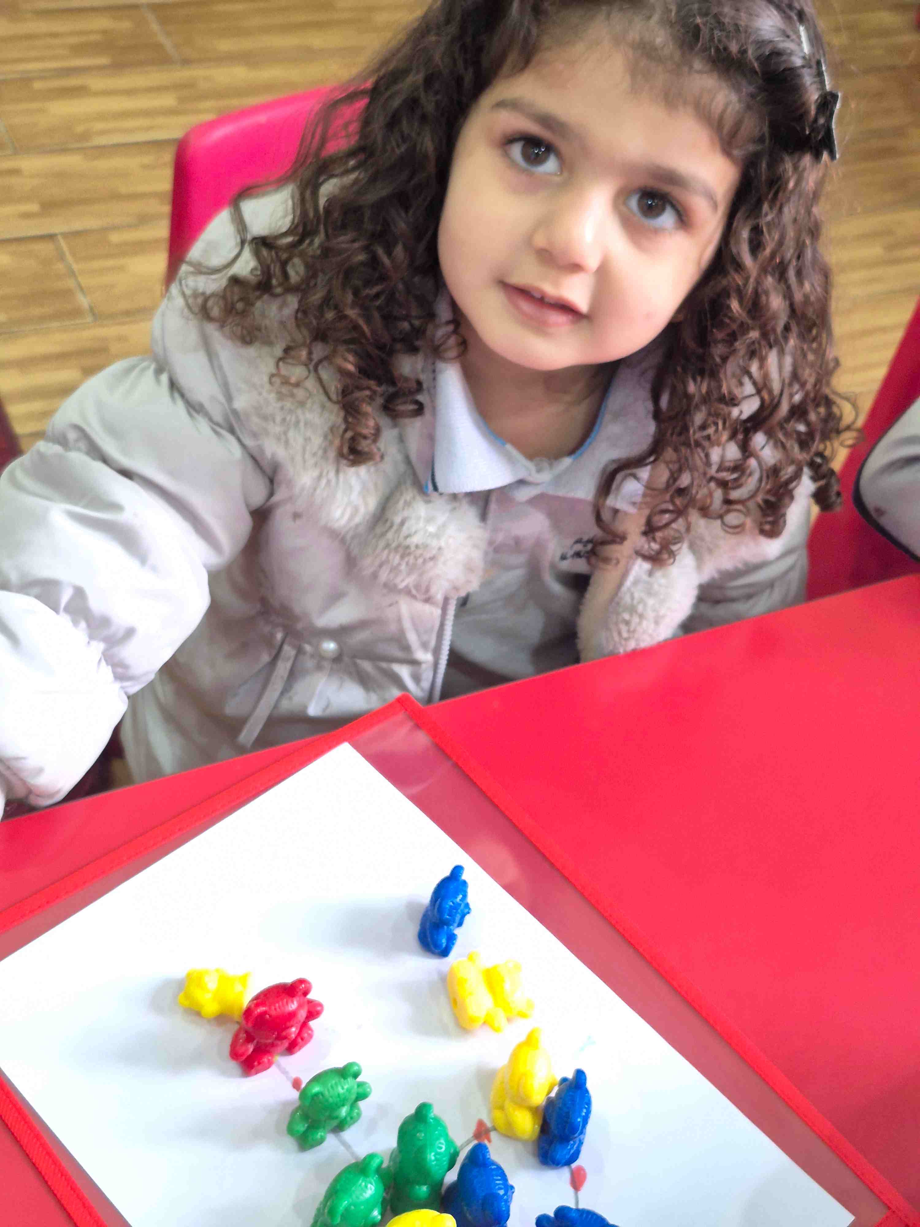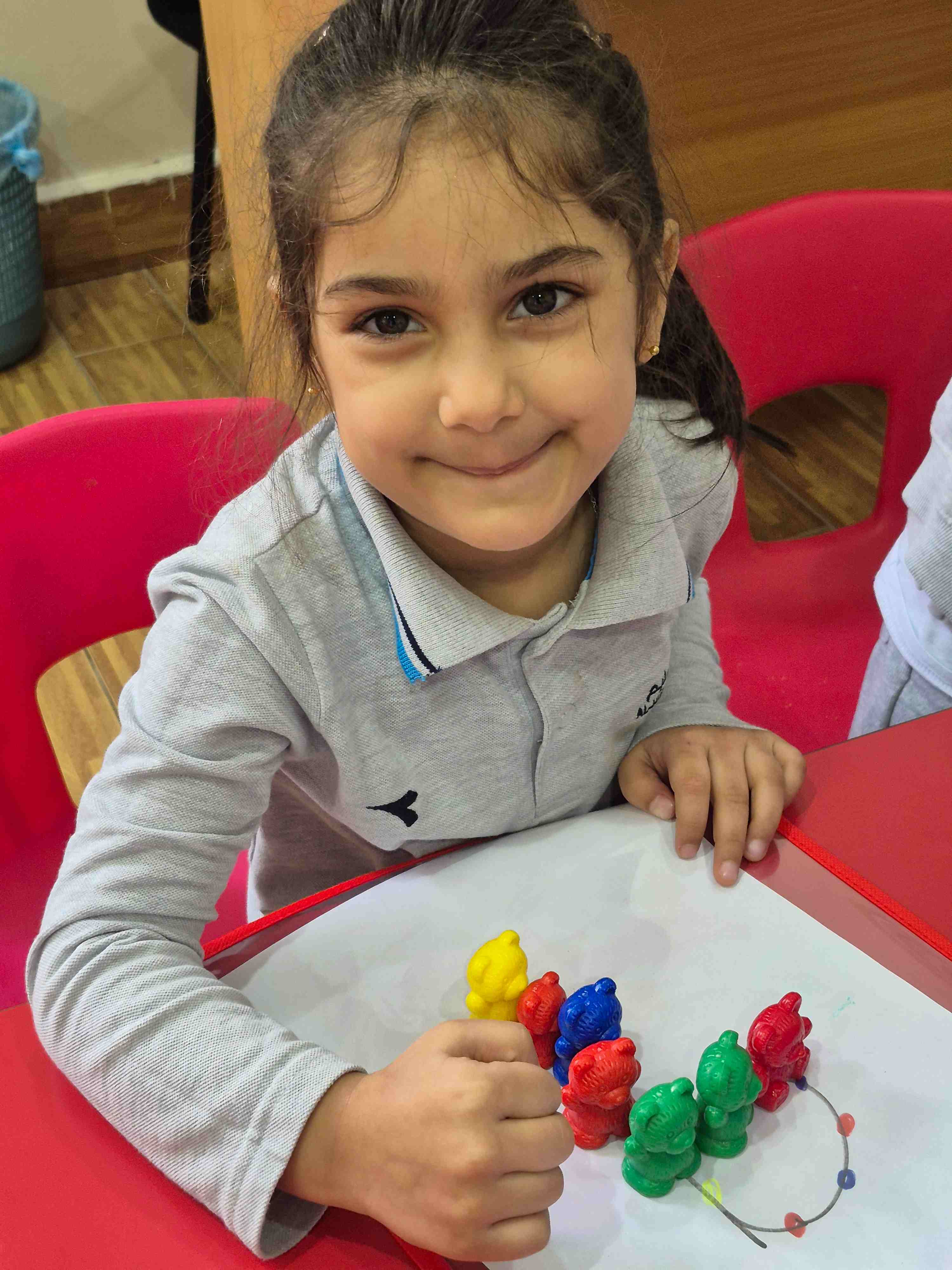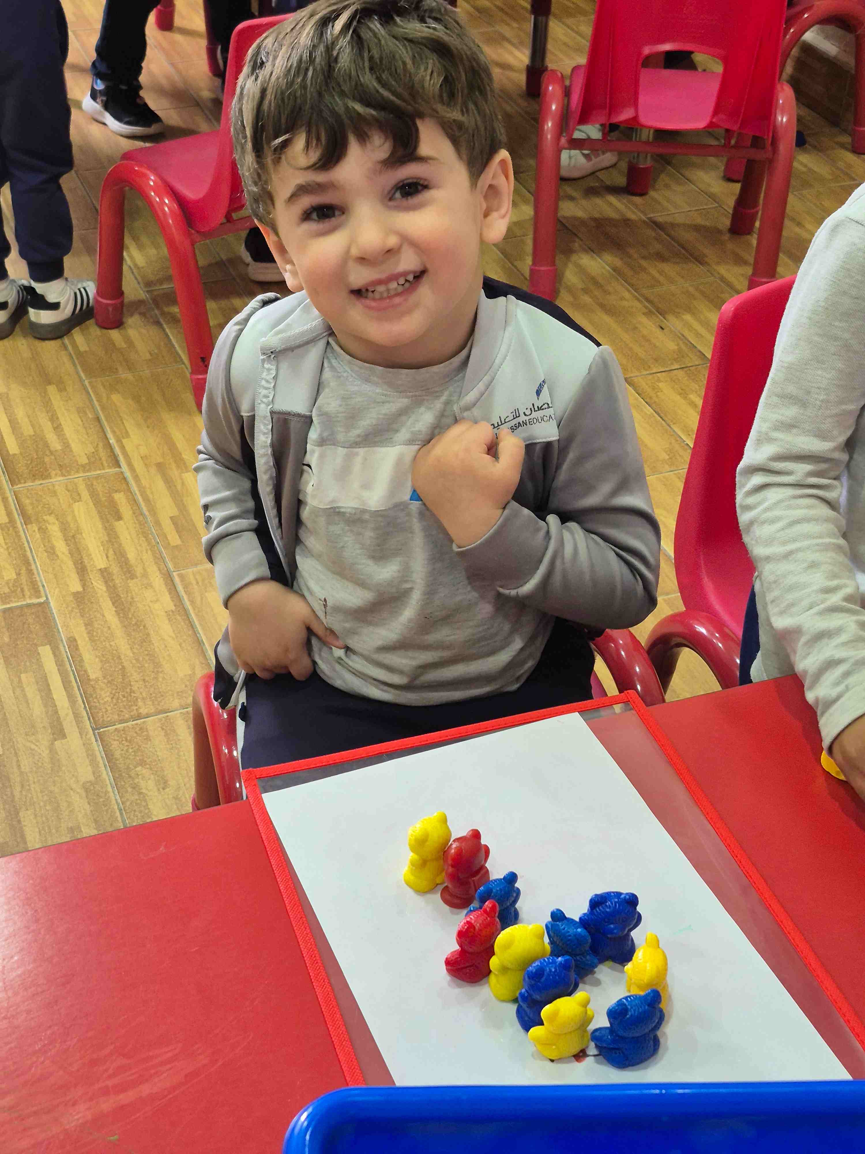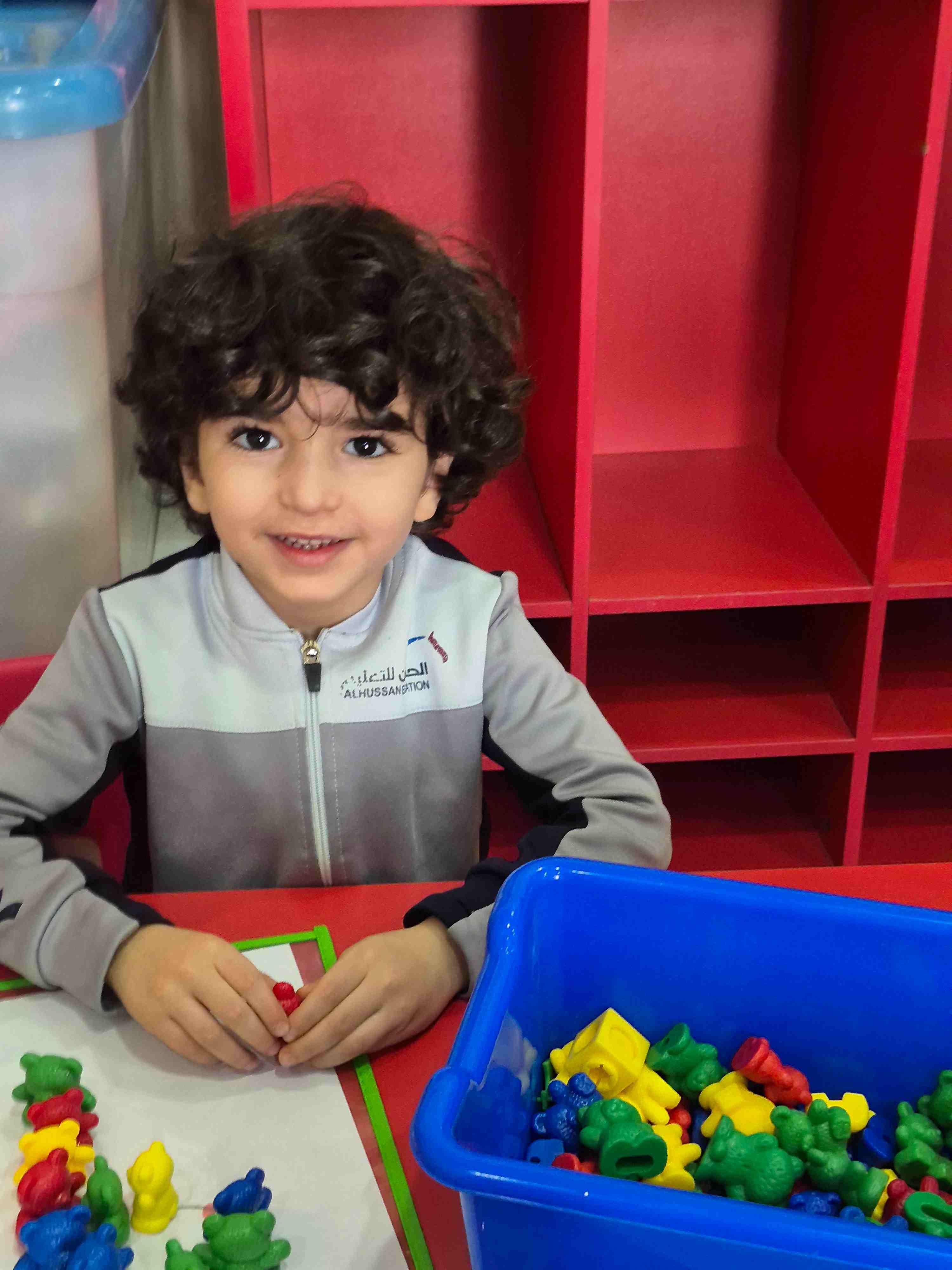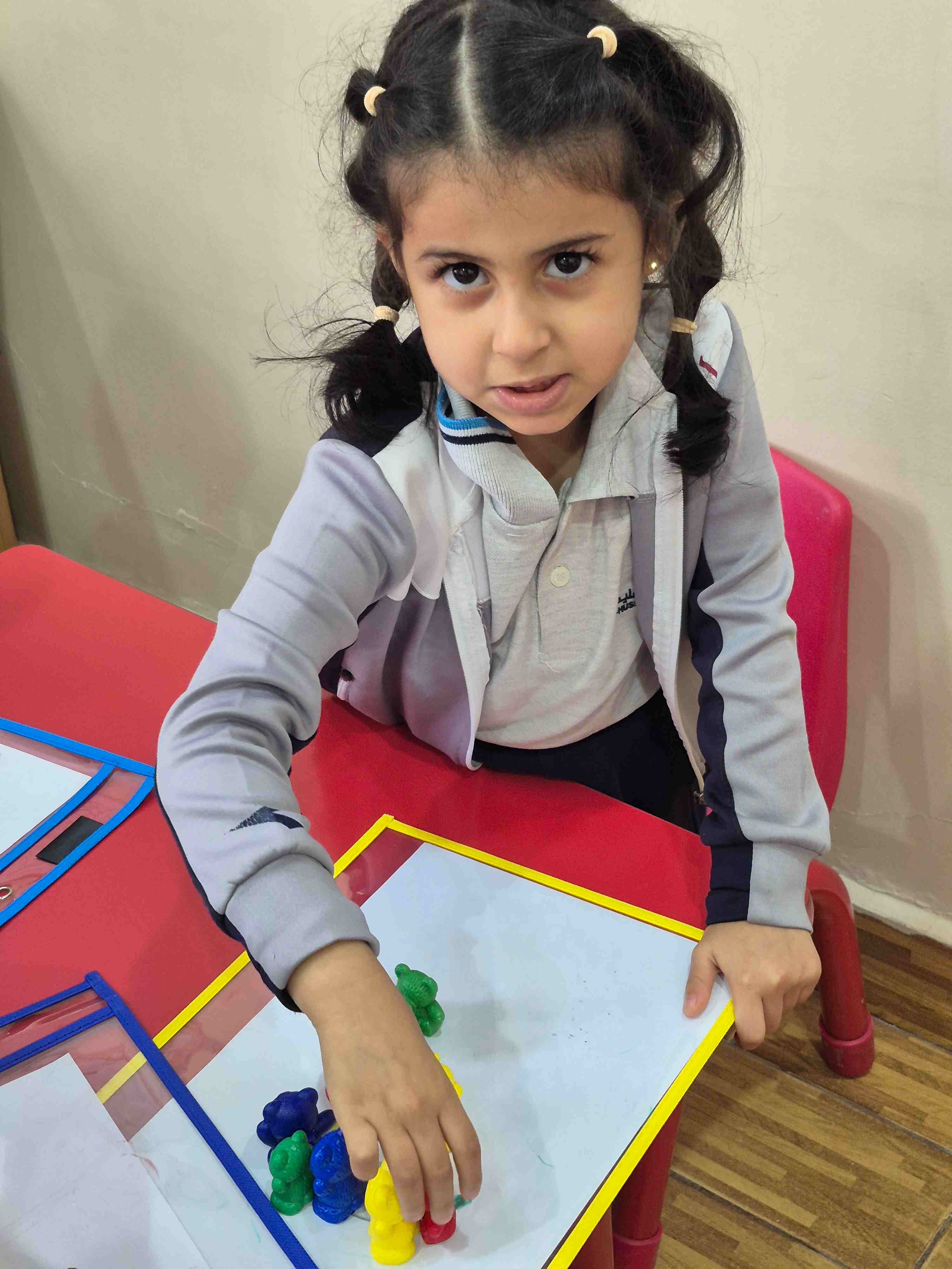 KG1 students at AlHussan International School -Riyadh practiced recognizing the number 9 by placing colored teddy bears on a number nine drawing. Each teddy bear was matched and placed according to the colored dots aligned on the number. This activity helped children with number recognition, color matching, and improved their fine motor skills through careful placement.